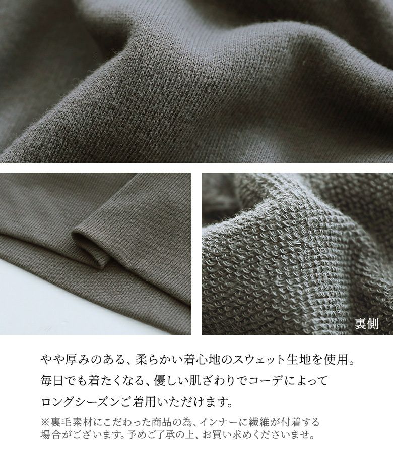 着心地も楽々な、やや厚みのあるスウェット生地。杢グレーは他ではあまり見かけないミックス調の織り地が特徴的。