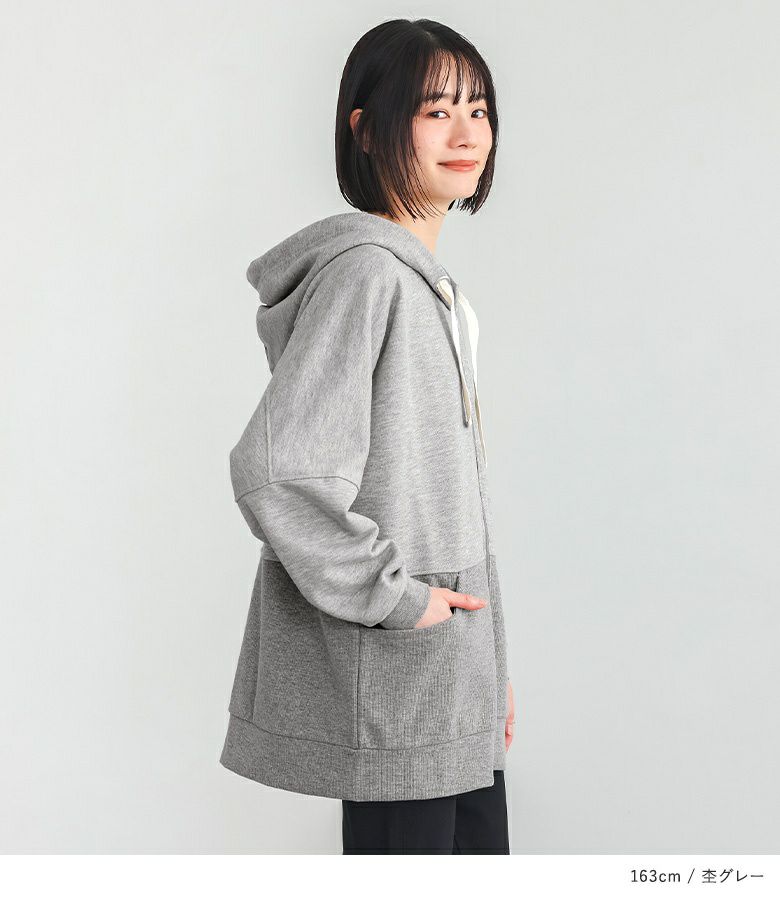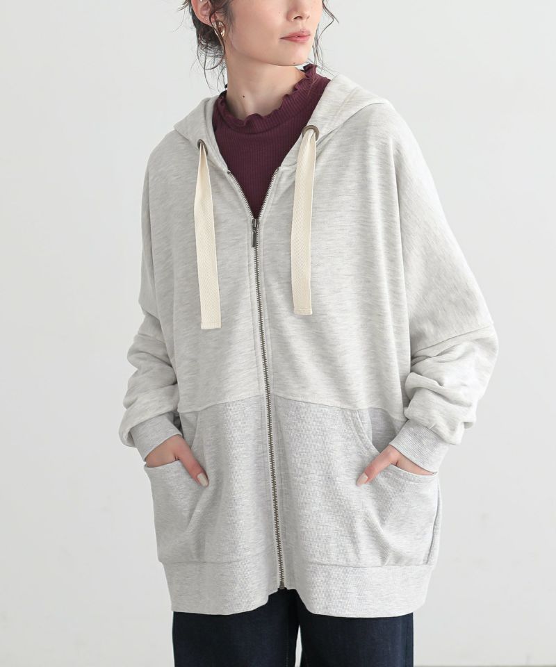 太めのハトメと配色リボンが、「普通とはちょっと違う」お洒落を演出する。立体感のあるゆるっと大きめフードのシルエットと身頃の切り替えリブが、さりげなくセンスの良さを醸し出します。