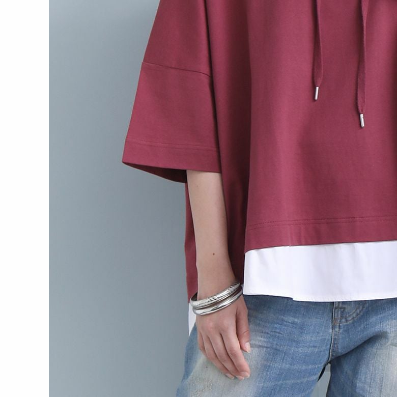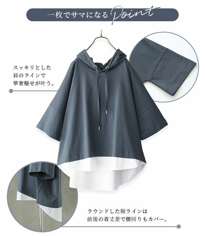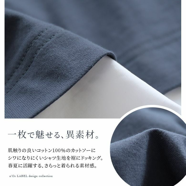 綿100%のカットソー生地とシャツ生地をドッキングした、重ね着風デザイン。お気に入りのボトムと合わせるだけで、かさばることなくレイヤードスタイルをお楽しみいただけます。