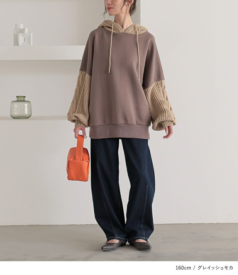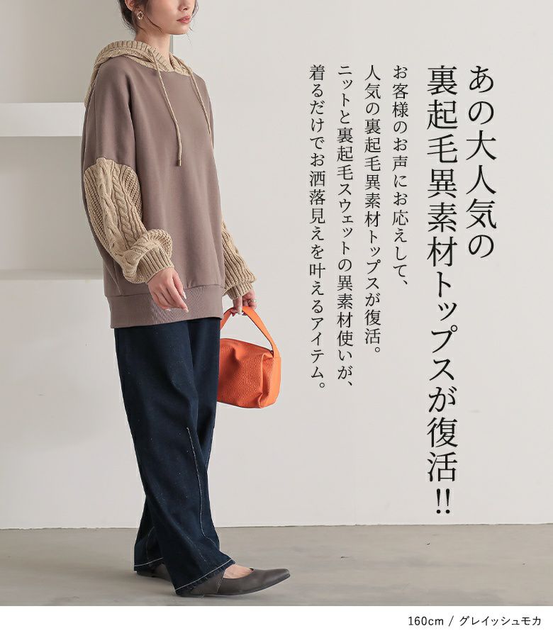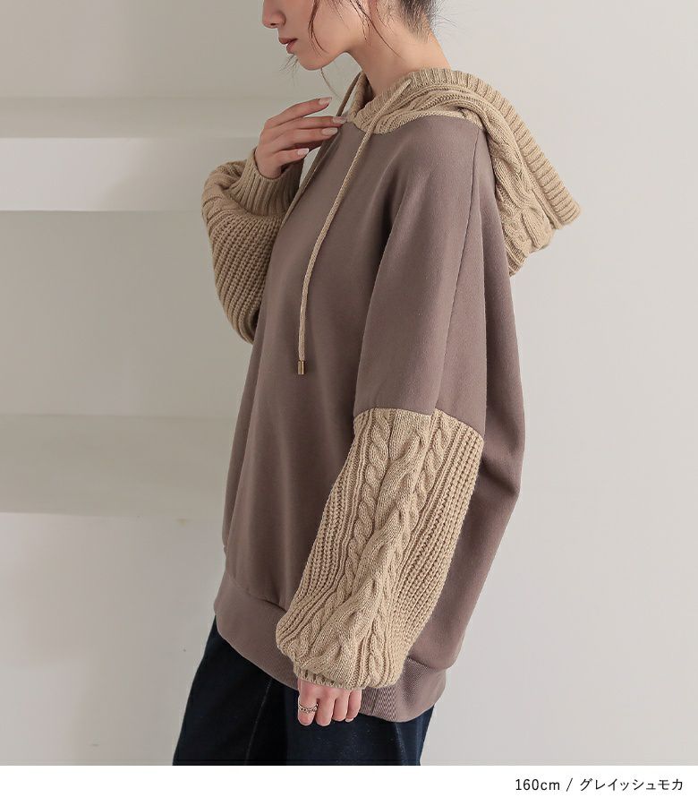ずっと触れていたいほど肌触りの良い裏起毛スウェットに、立体感のあるローゲージのケーブルニットをドッキング。一枚で着てもあったかお洒落が叶います。