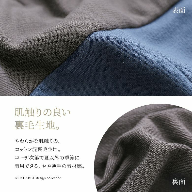 柔らかな肌触りのコットン混裏毛生地を使用。やや薄手の素材感だから、ロングシーズン着こなしていただけます。