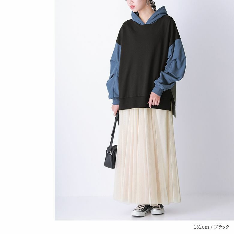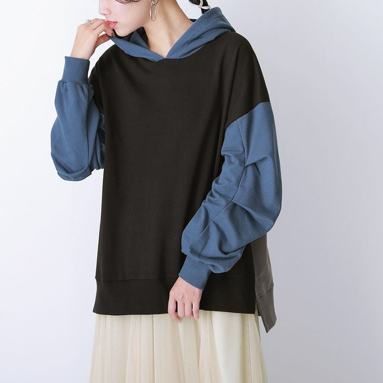 立体的なシルエットを作り出すタック入りのビッグスリーブデザインがお洒落ポイント。フードはゆったりとしたサイズ感に仕立て、前後差のある着丈と裾に入ったスリットが抜け感をプラスします。