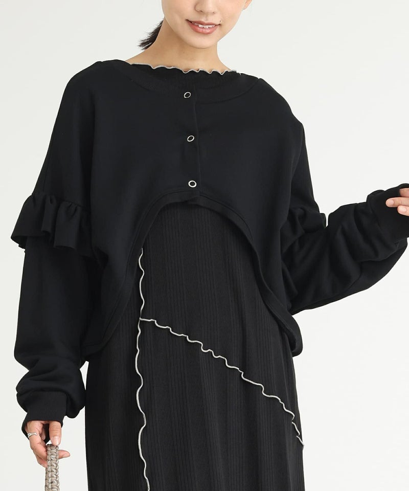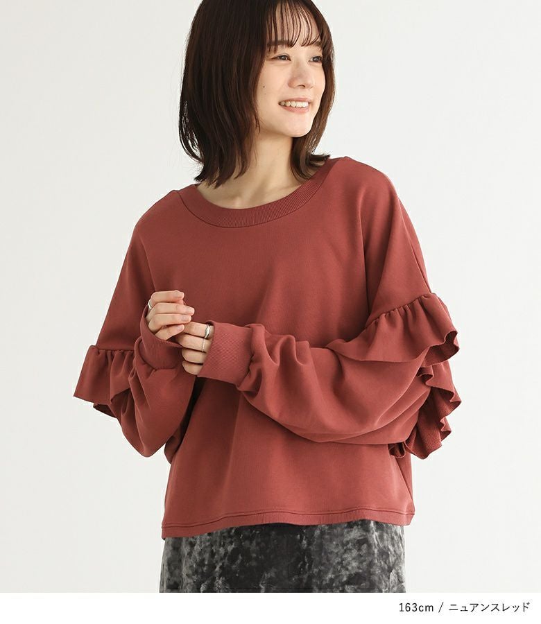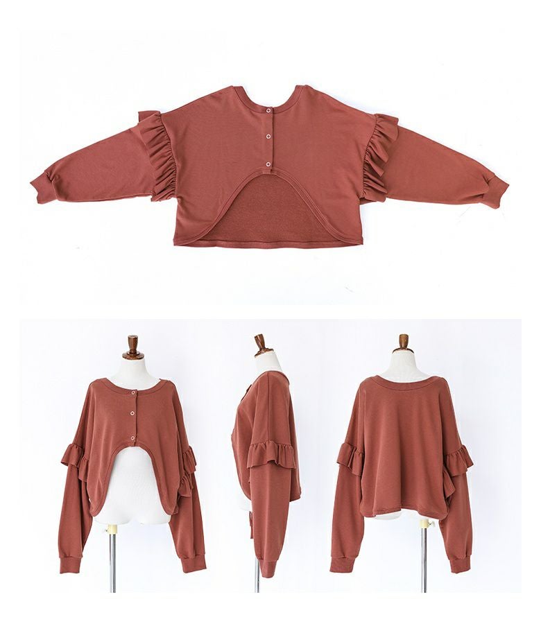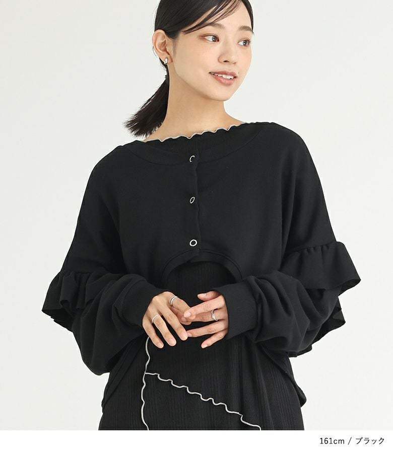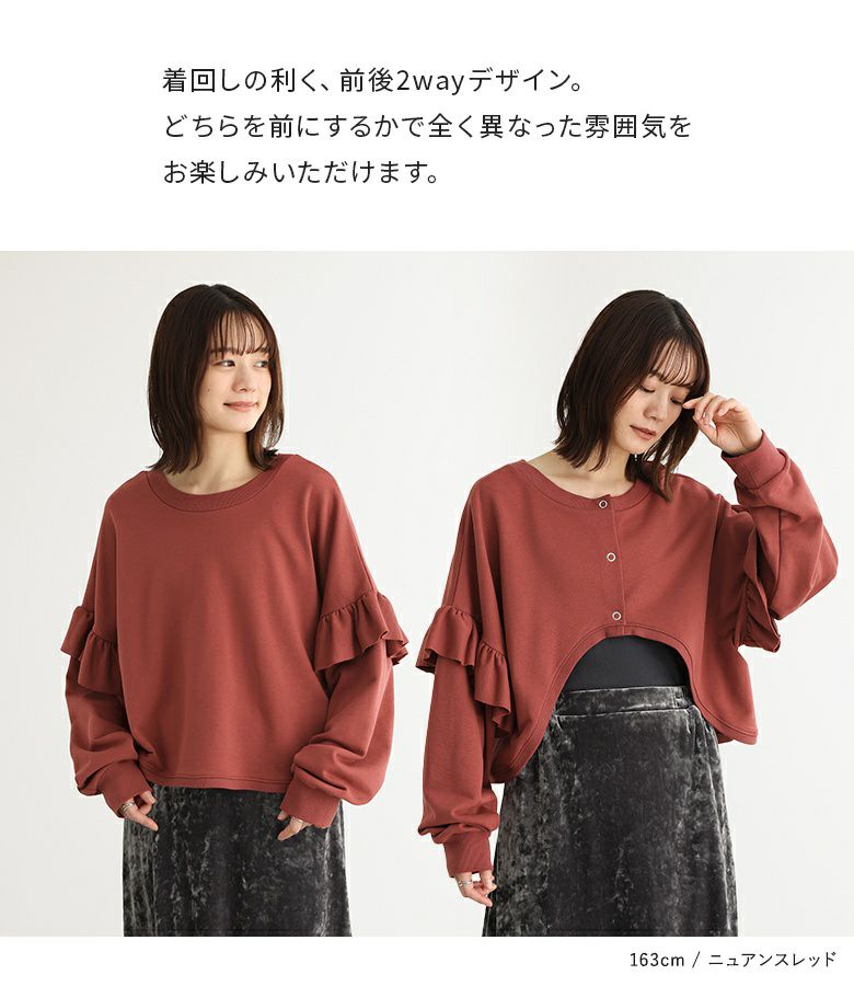 袖のフリルがポイントになった、前後で着用できる2wayデザインのトップス。