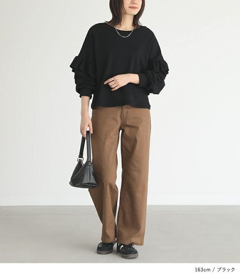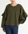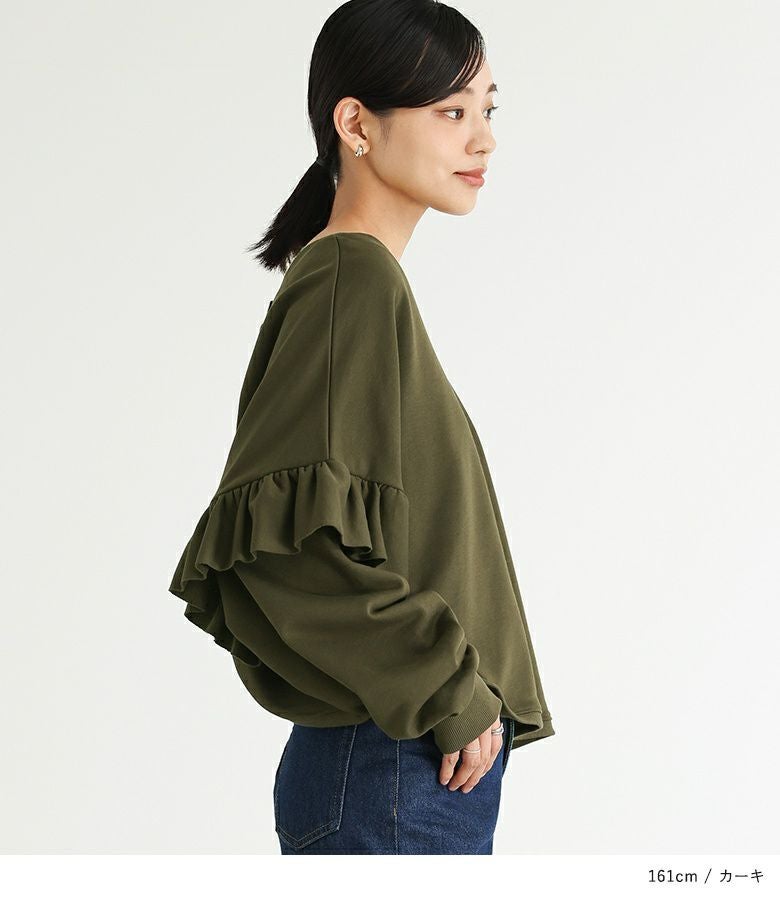 袖のフリルがポイントになった、前後で着用できる2wayデザインのトップス。どちらを前にするかで全く異なった雰囲気をお楽しみいただけます。ショート丈のゆるっとしたシルエットで、様々なアイテムに合わせやすい一枚。