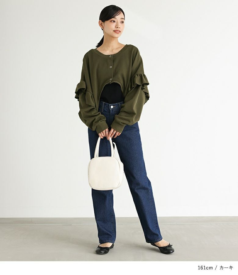 パンツ、スカートどちらにも合わせやすいデザイン。ボタン側を前にして、インに着用したアイテムをちらっと見せるレイヤードスタイルもおすすめです。ボタンを開けてボレロ風の羽織りとしても着回していただけます。