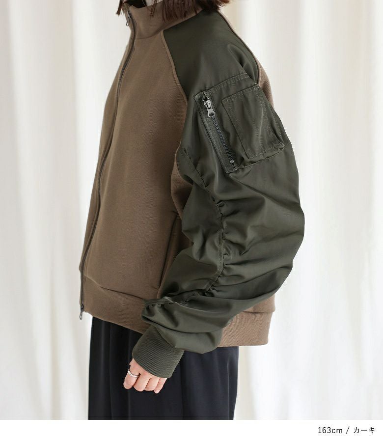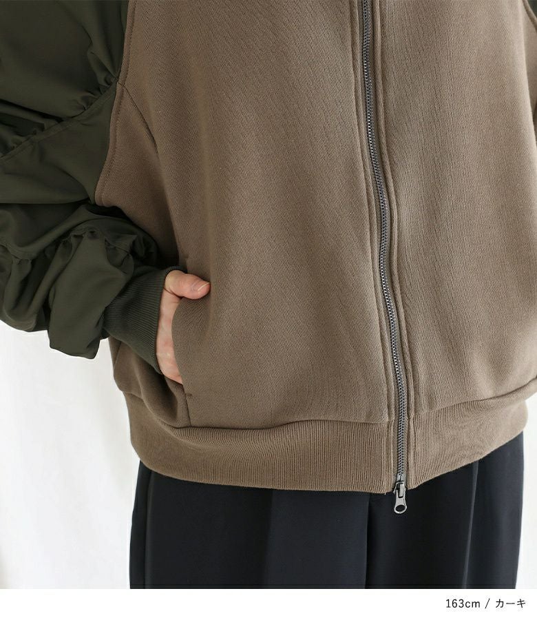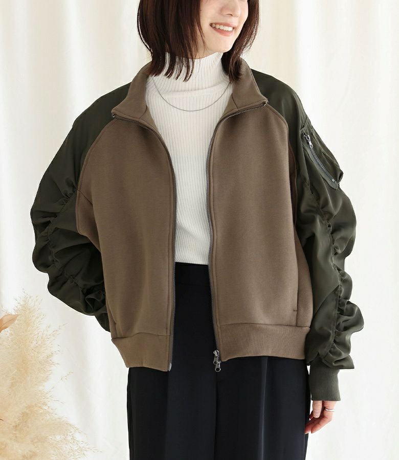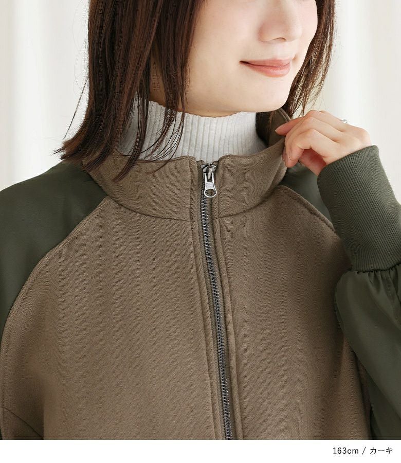 袖の配色と異素材感がポイントになるスウェットブルゾン。