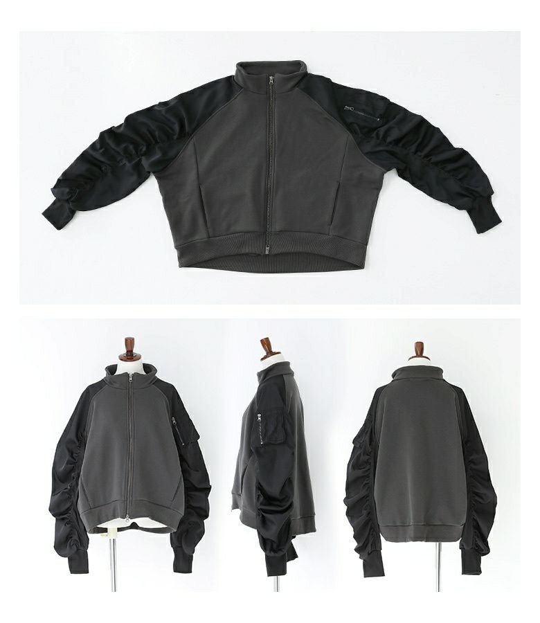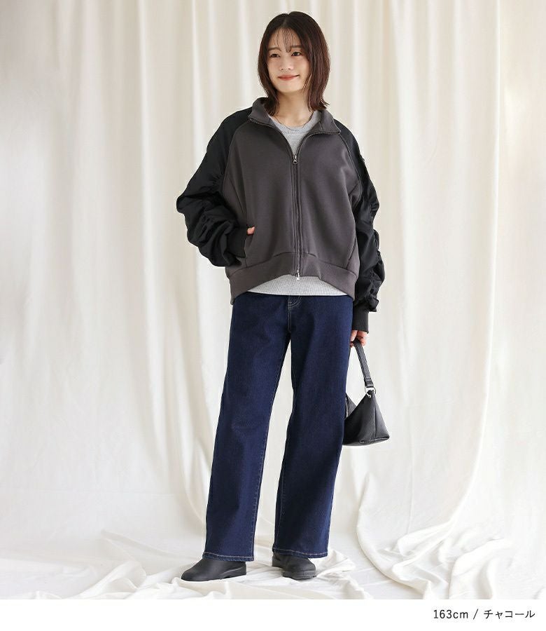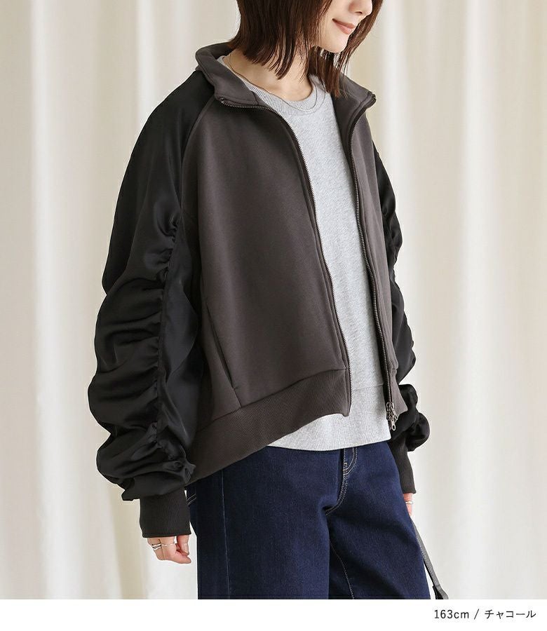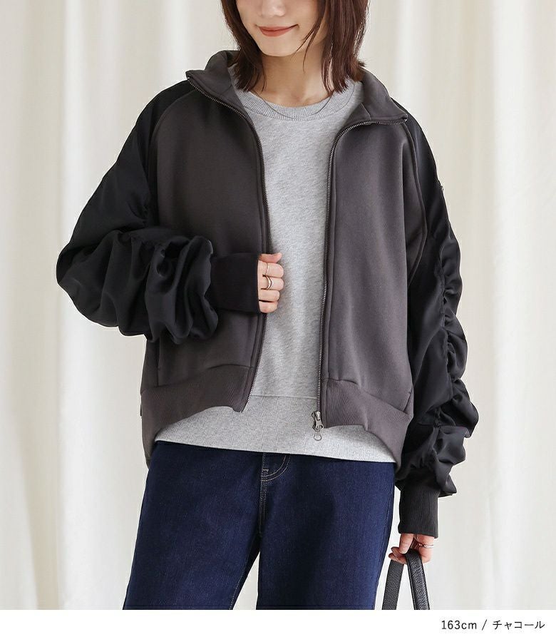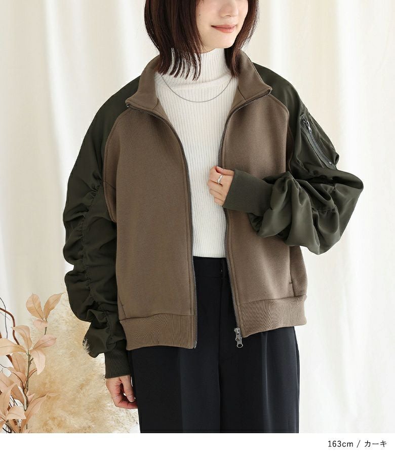 袖の配色と異素材感がポイントになるスウェットブルゾン。