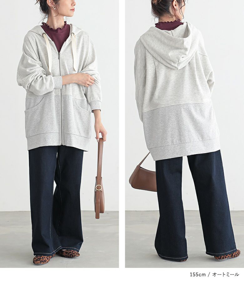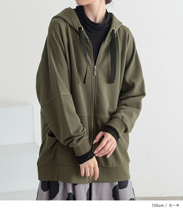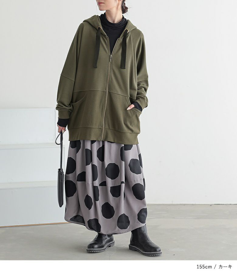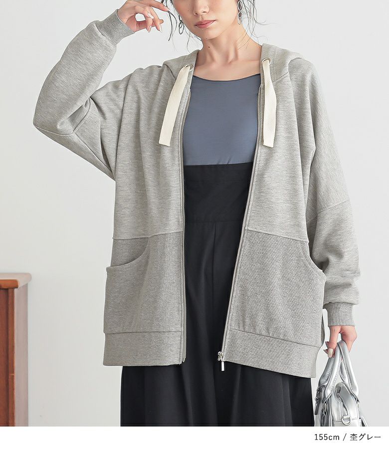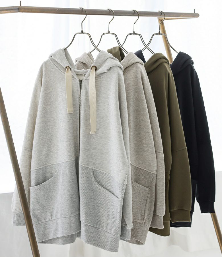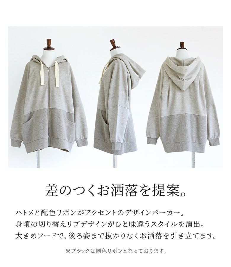 太めのハトメと配色リボンが、「普通とはちょっと違う」お洒落を演出する。立体感のあるゆるっと大きめフードのシルエットと身頃の切り替えリブが、さりげなくセンスの良さを醸し出します。