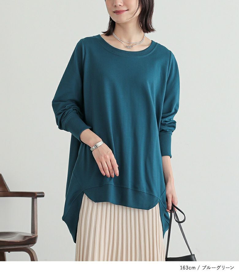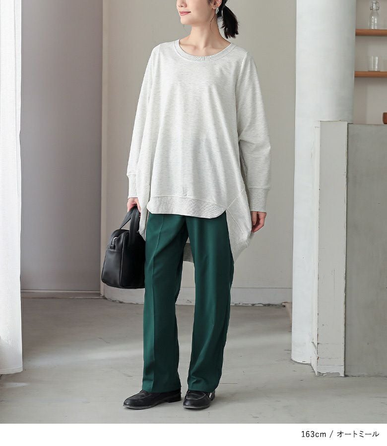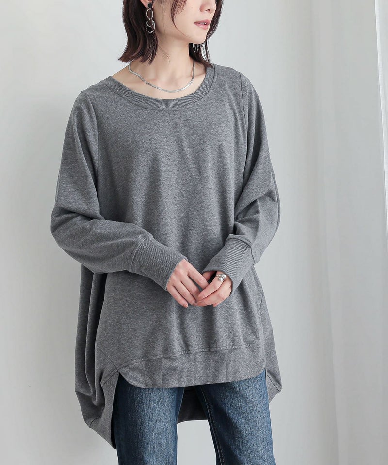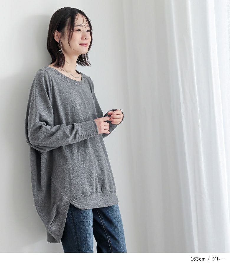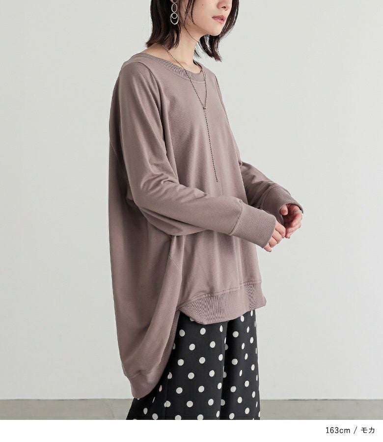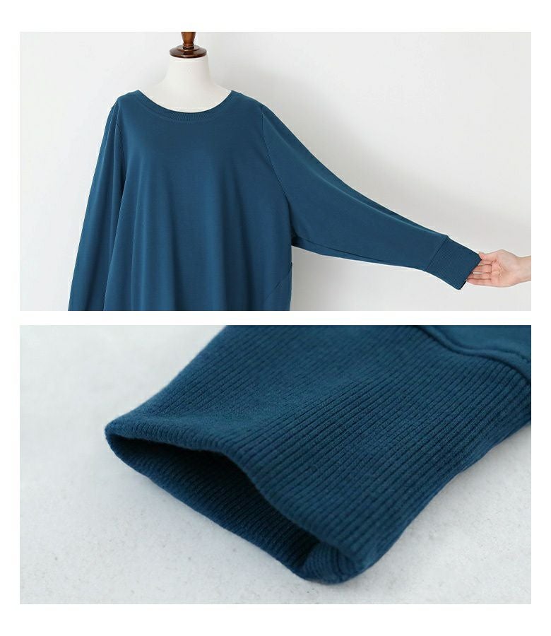 シンプルに見えてメリハリがつく秘密は、袖口と裾のリブ仕様。さらっと心地よいミニ裏毛スウェット生地でロングシーズンお洒落に着られる優れものトップスです。