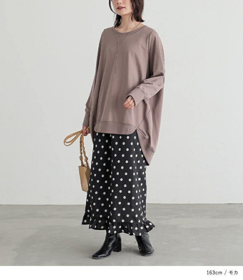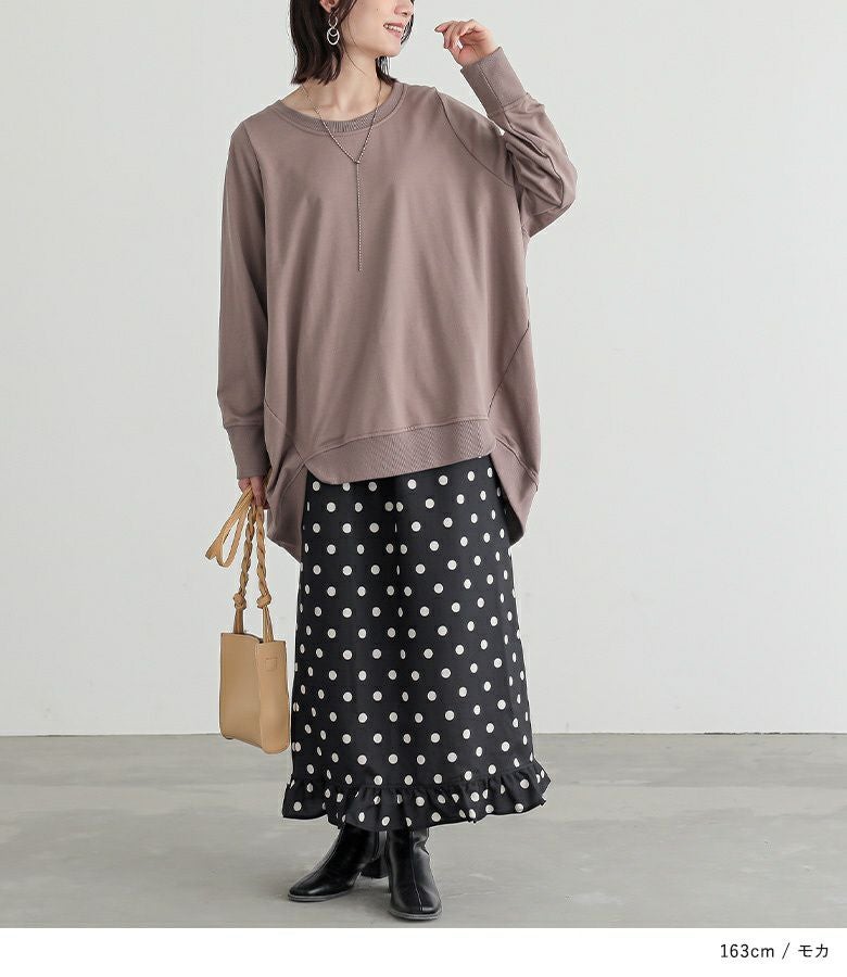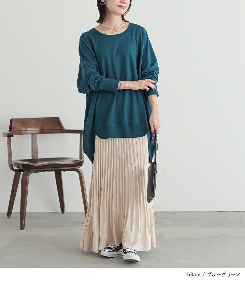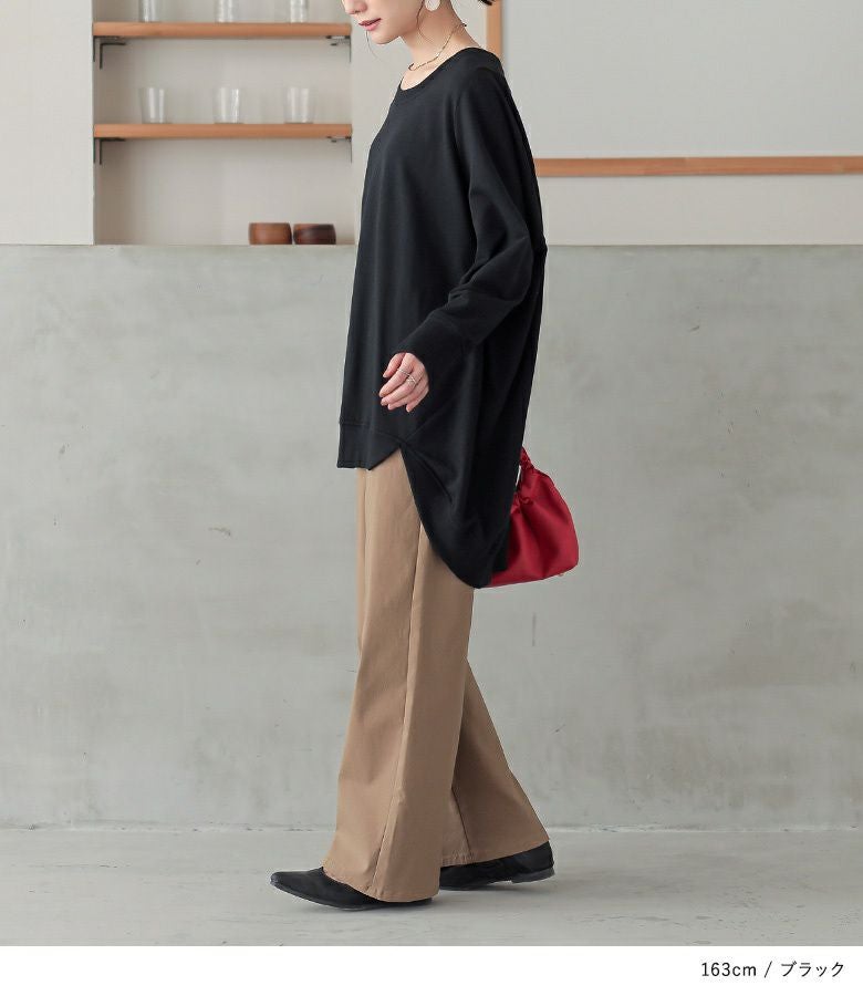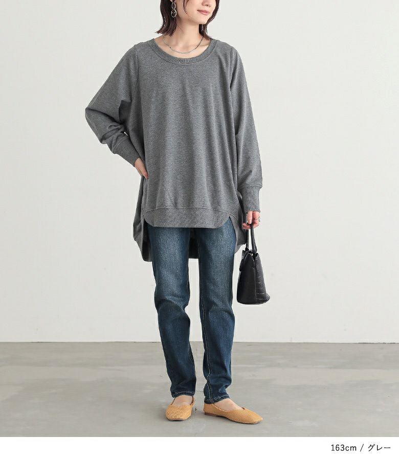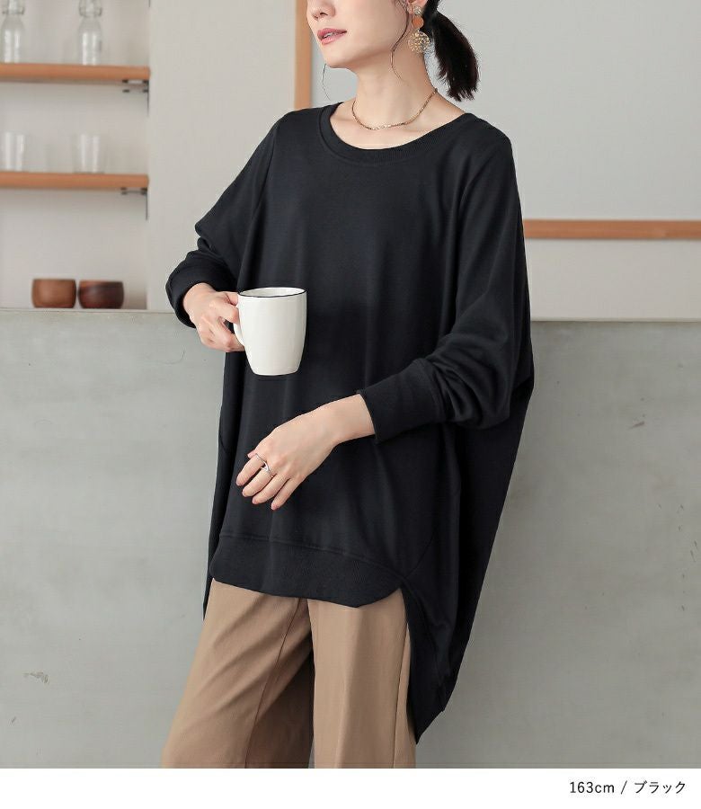 シンプルに見えてメリハリがつく秘密は、袖口と裾のリブ仕様。さらっと心地よいミニ裏毛スウェット生地でロングシーズンお洒落に着られる優れものトップスです。