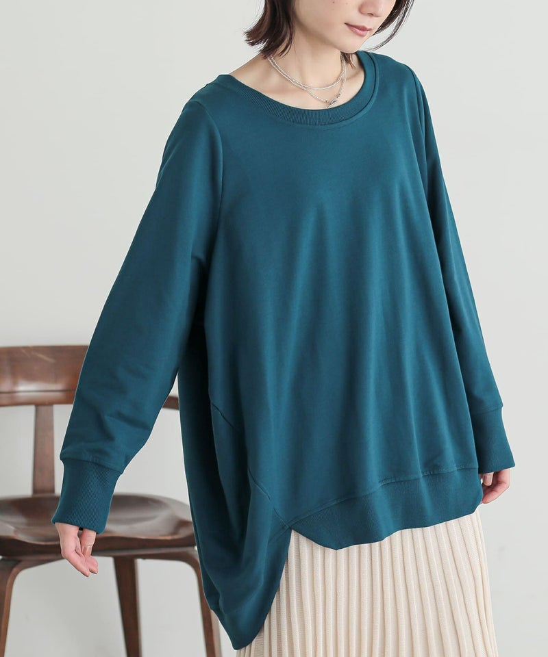 計算された変形裾ラインのサイドから覗く、こだわり抜かれた切り替えシルエット。前後で着丈差をつたデザインだから、ゆるっと着られてスタイルアップも叶う♪