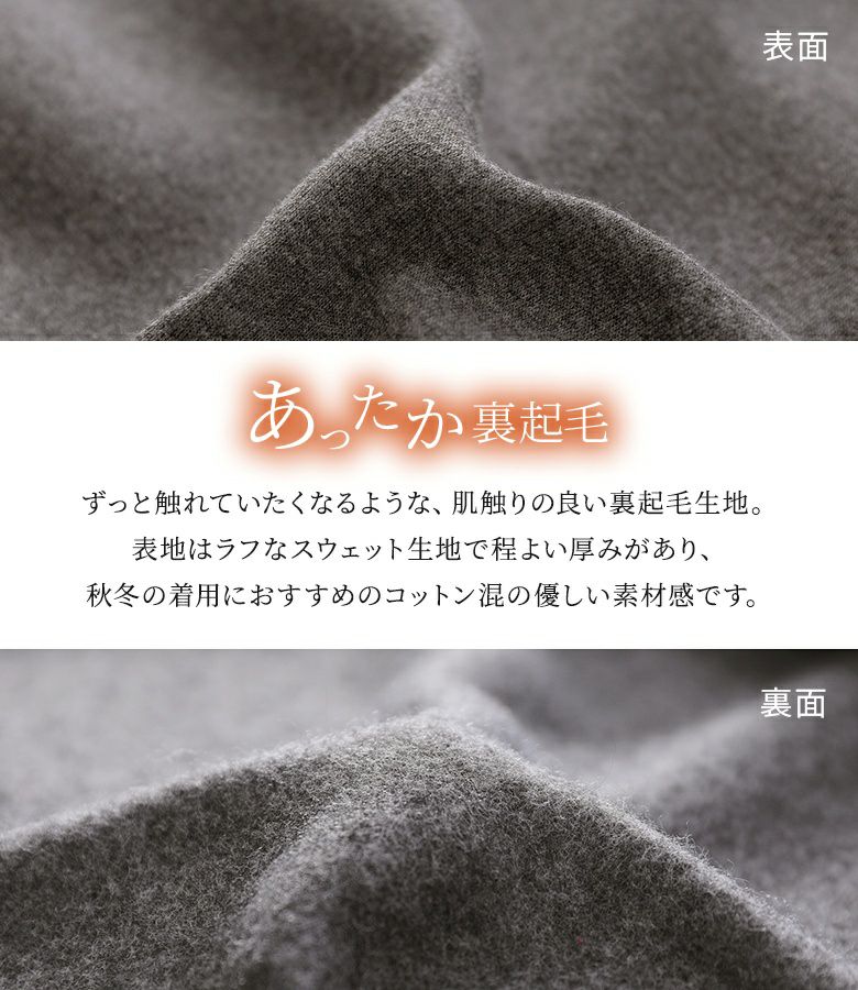 肌触りの良いあったか裏起毛生地に、表地はラフなスウェット生地で、程よい厚みがありコットン混の優しい素材感。
