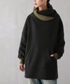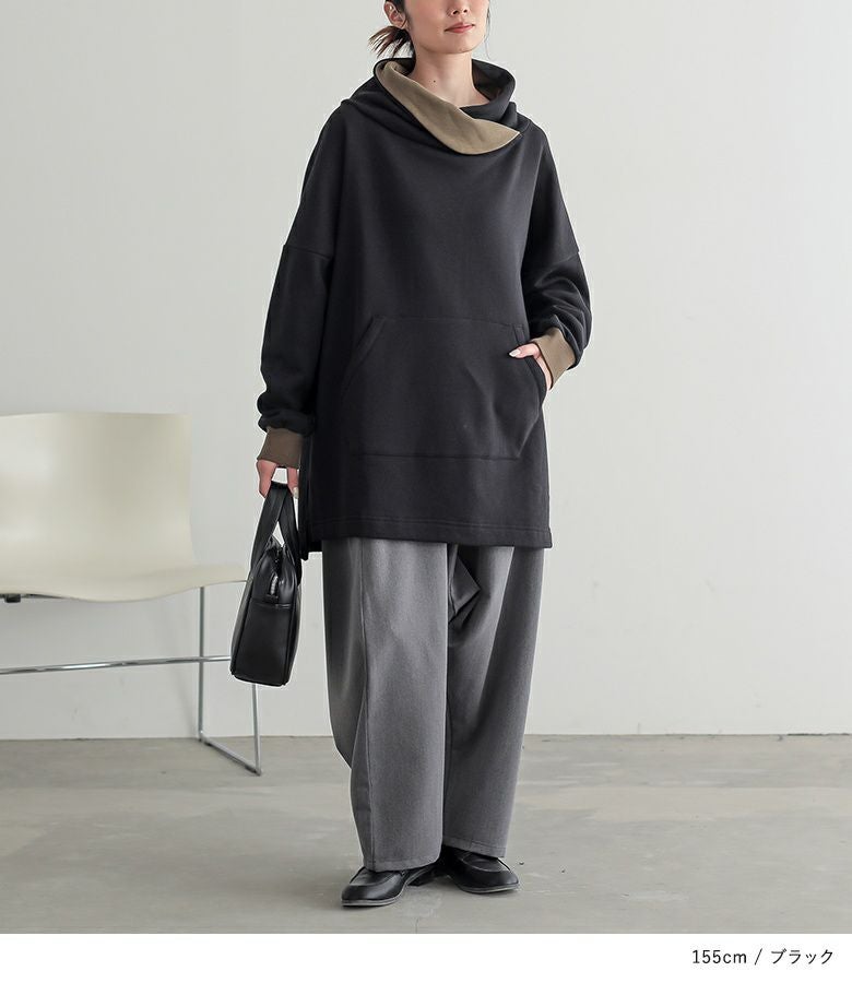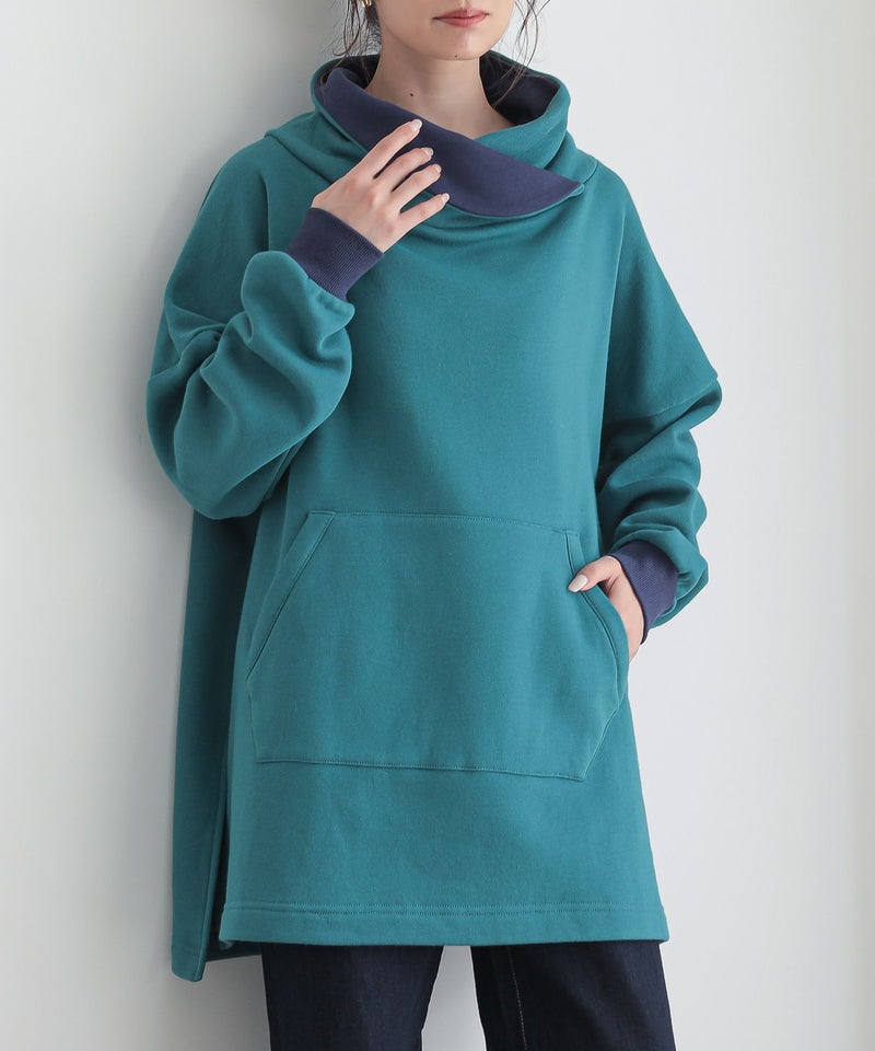 ゆるっと着られるドロップショルダーのシルエットに、大きめのカンガルーポケットがお洒落なポイントに。ただ着るだけで簡単にくしゅっときまり、配色部分がちらりと見える計算されたネックデザインが魅力です。