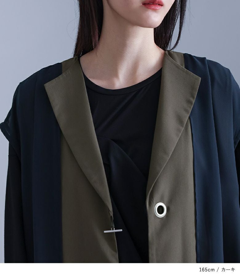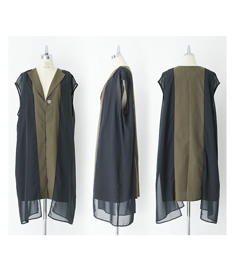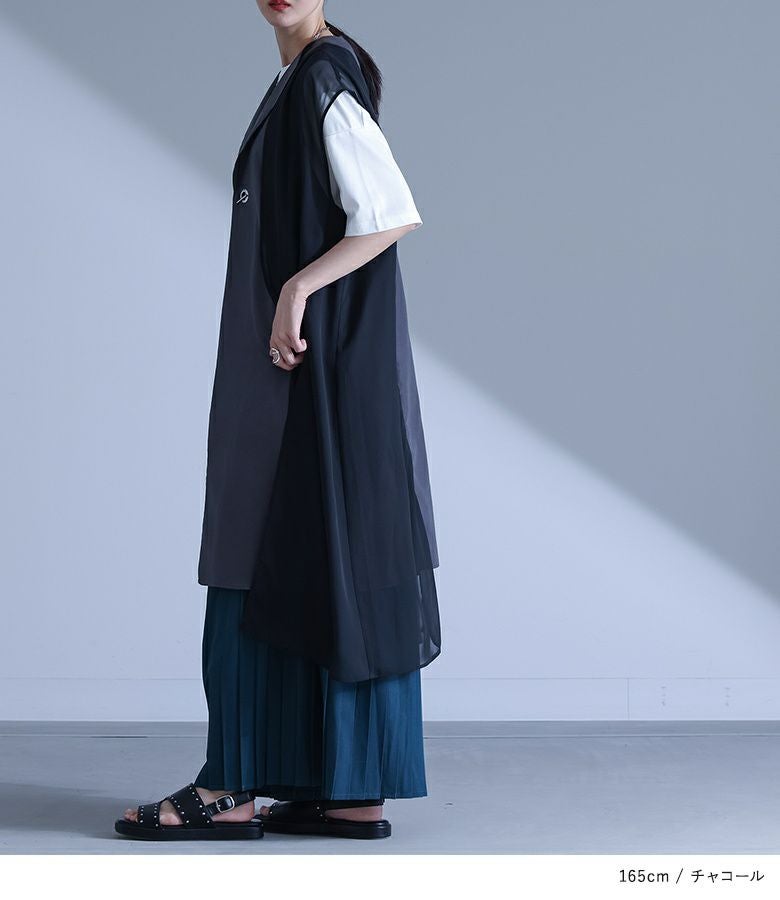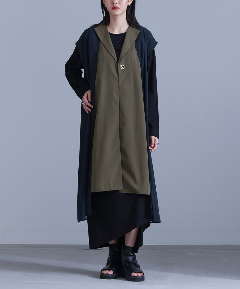 異素材の組み合わせが目を惹くロングジレ。配色のシアー素材がドッキングされ、シアー部分は丈が長くフラシ仕様で、歩くたびに軽やかな動きを演出します。内側の身頃サイドには実用的なポケット付きで、機能性も抜群。フロントには金属トグルをハトメに通すデザイン性の高い留め具を採用し、モードな印象に仕上げました。シンプルなスタイリングに羽織るだけでこなれ感をプラスする、主役級アイテムです。