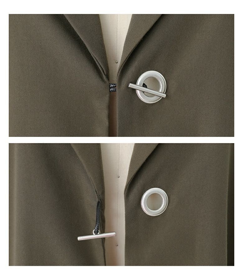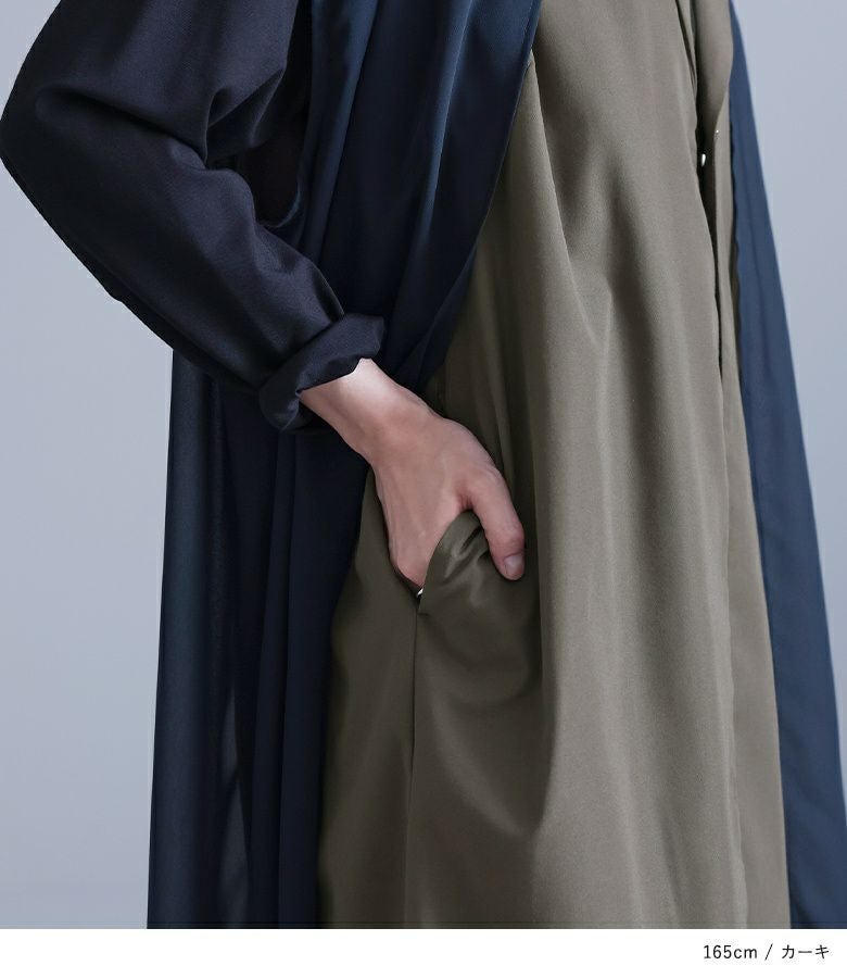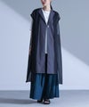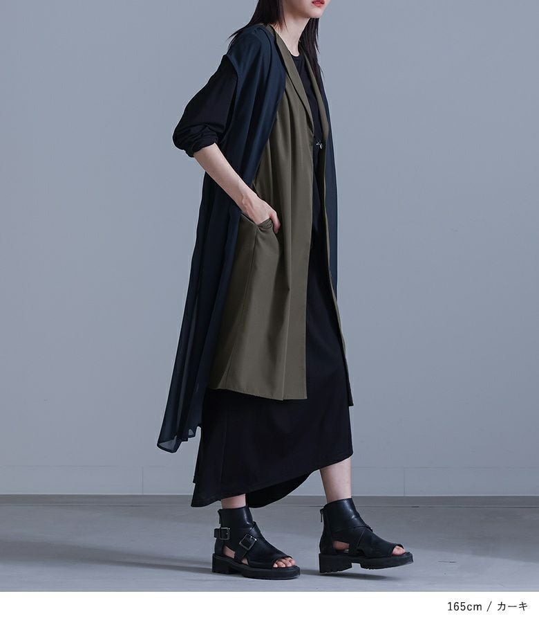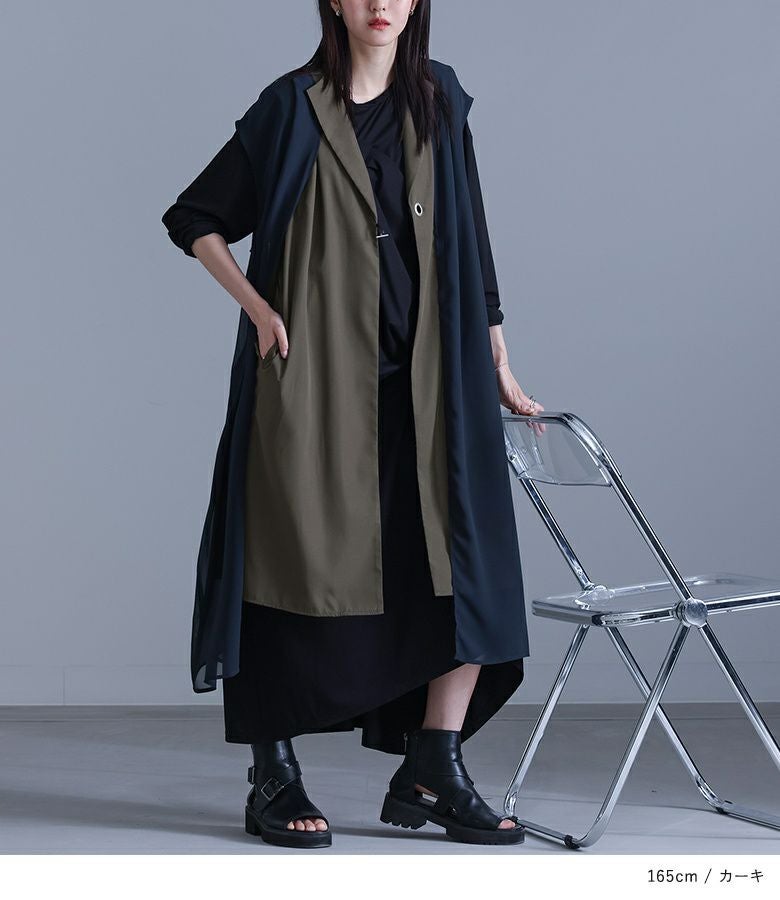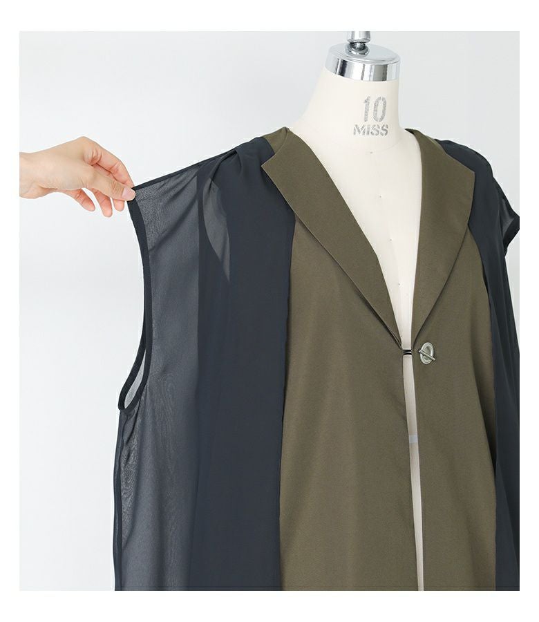 異素材の組み合わせが目を惹くロングジレ。配色のシアー素材がドッキングされ、シアー部分は丈が長くフラシ仕様で、歩くたびに軽やかな動きを演出します。内側の身頃サイドには実用的なポケット付きで、機能性も抜群。フロントには金属トグルをハトメに通すデザイン性の高い留め具を採用し、モードな印象に仕上げました。シンプルなスタイリングに羽織るだけでこなれ感をプラスする、主役級アイテムです。
