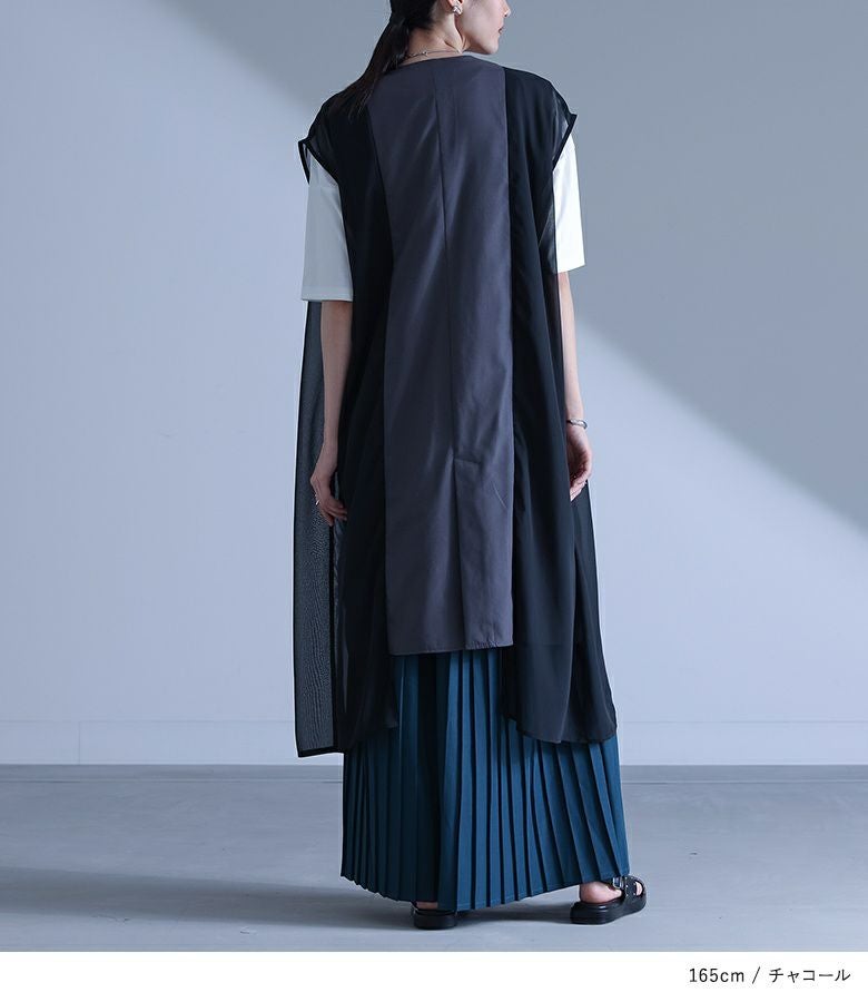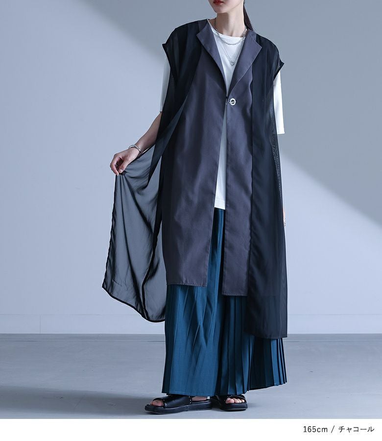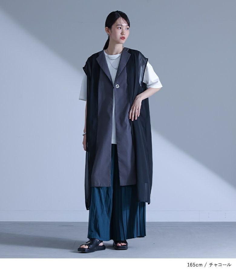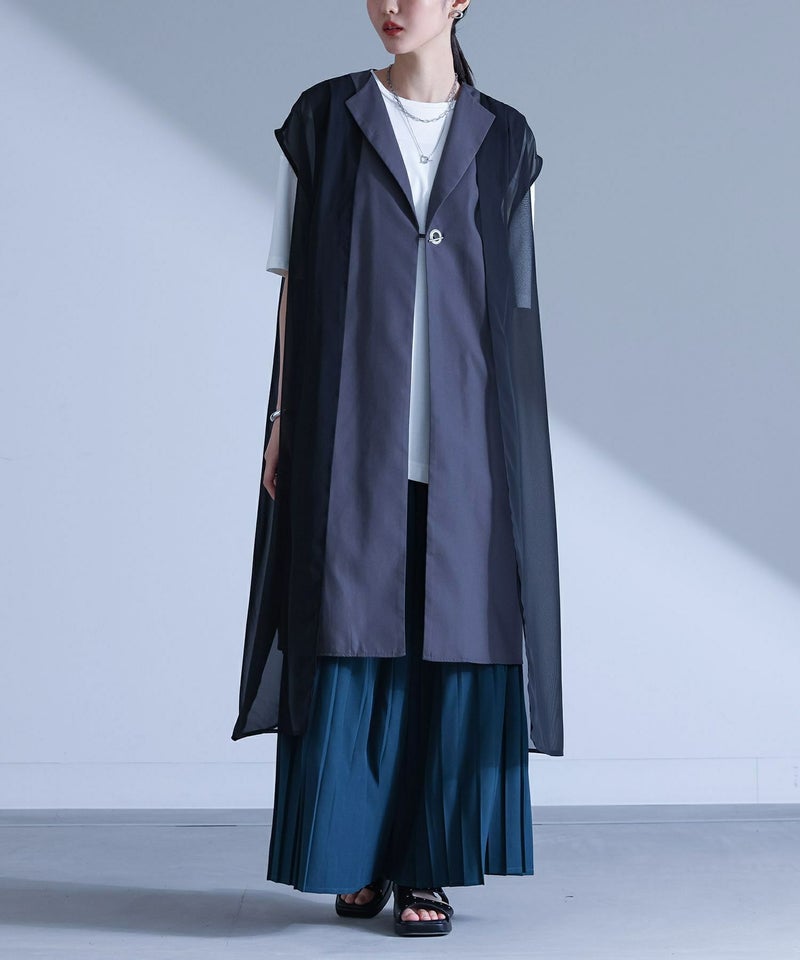 シアー素材のロングジレにプリーツデザインのボトムを合わせれば、女性らしさと動きのあるエレガントなスタイルに。ジレの軽やかさとスカートの揺れ感が絶妙にマッチし、歩くたびに視線を引く華やかさを演出します。足元をレザーアイテムでまとめることで洗練された着こなしに。