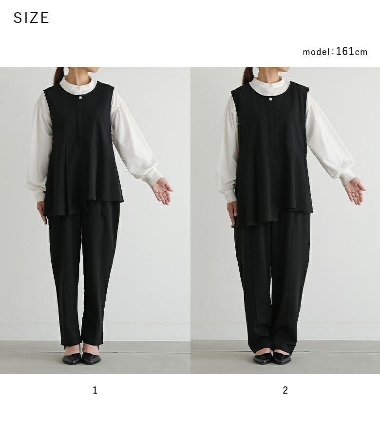 サイズ1のジレはややタイトで、動きによっては少し窮屈に感じました。パンツはほどよいフィット感です。サイズ2は全体的にほどよいゆとりできれいなシルエットでした。私の場合は、2を選びます。