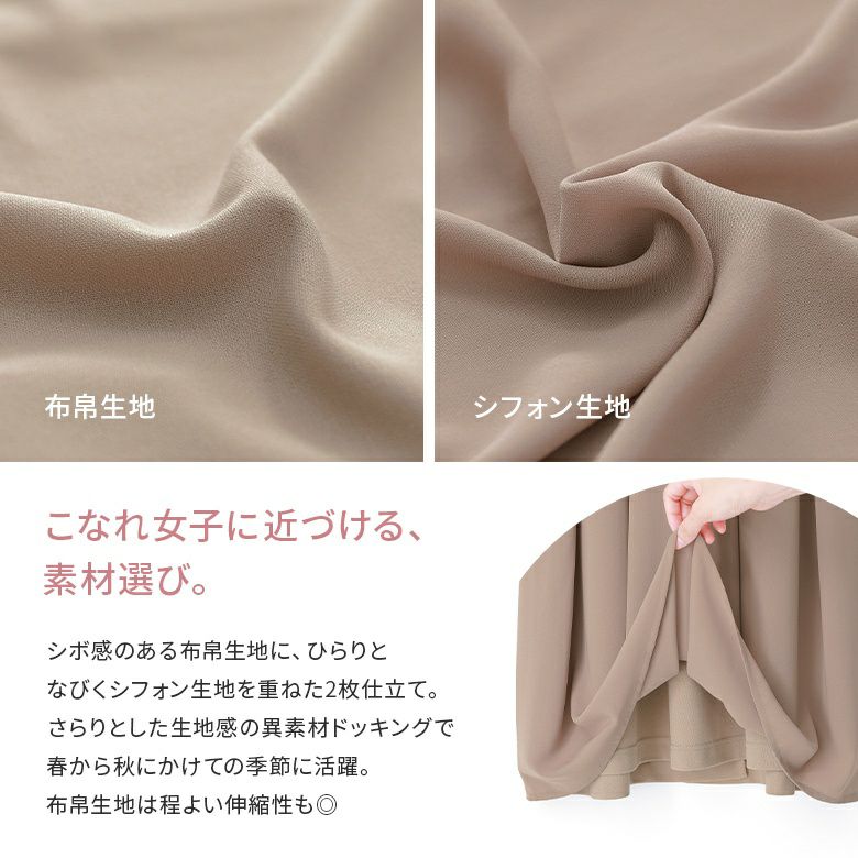 シボ感のある布帛生地にひらりとなびくシフォン生地を重ねた2枚仕立て。さらりとした生地感の組み合わせで、ロングシーズン着用いただけます。