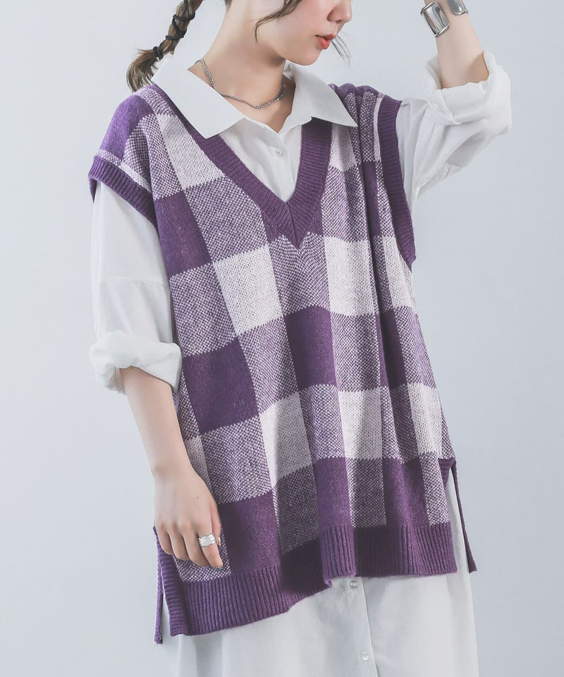 大きめのギンガムチェックがお洒落に着映える、ジャカードニットベスト♪