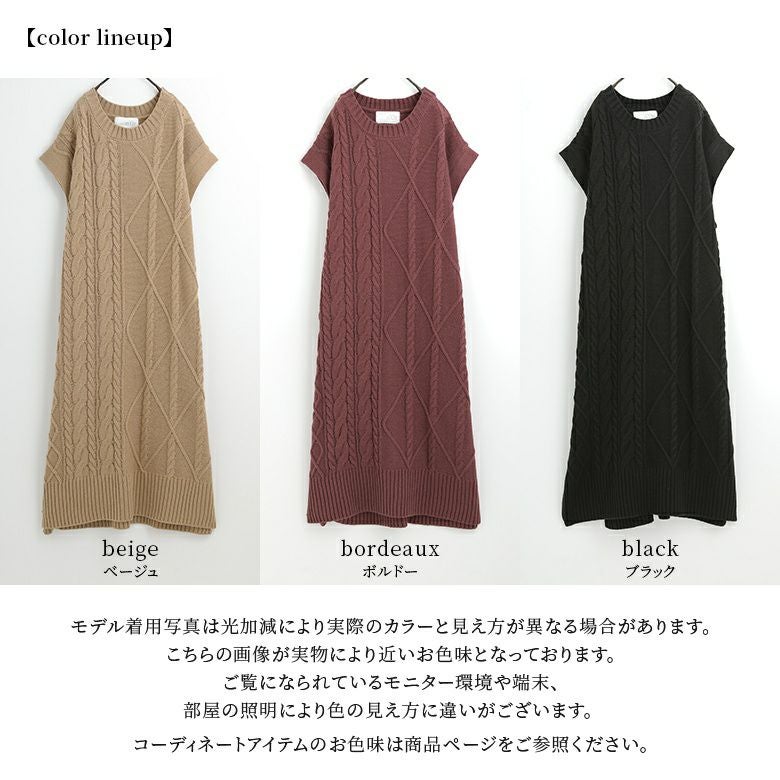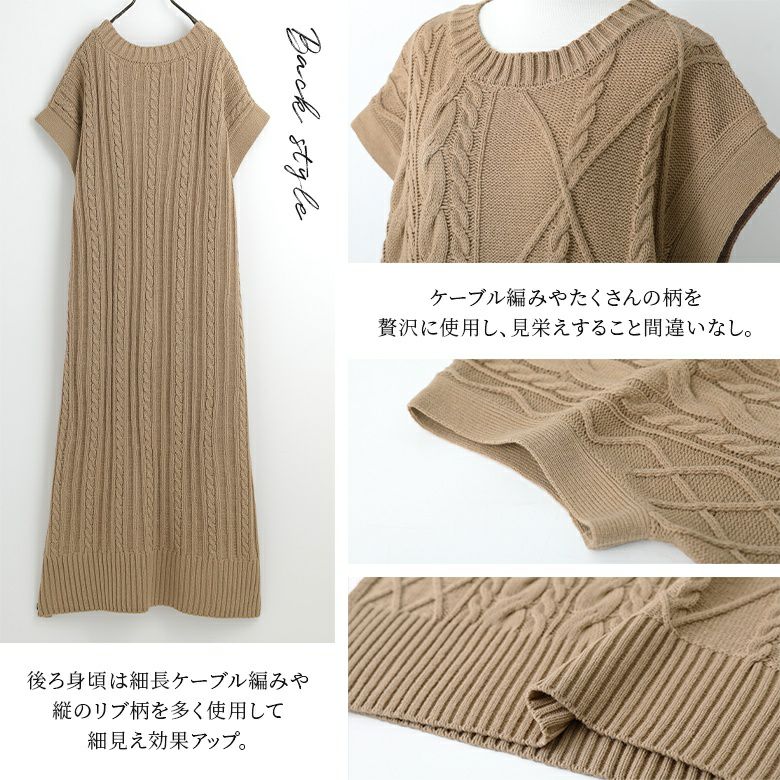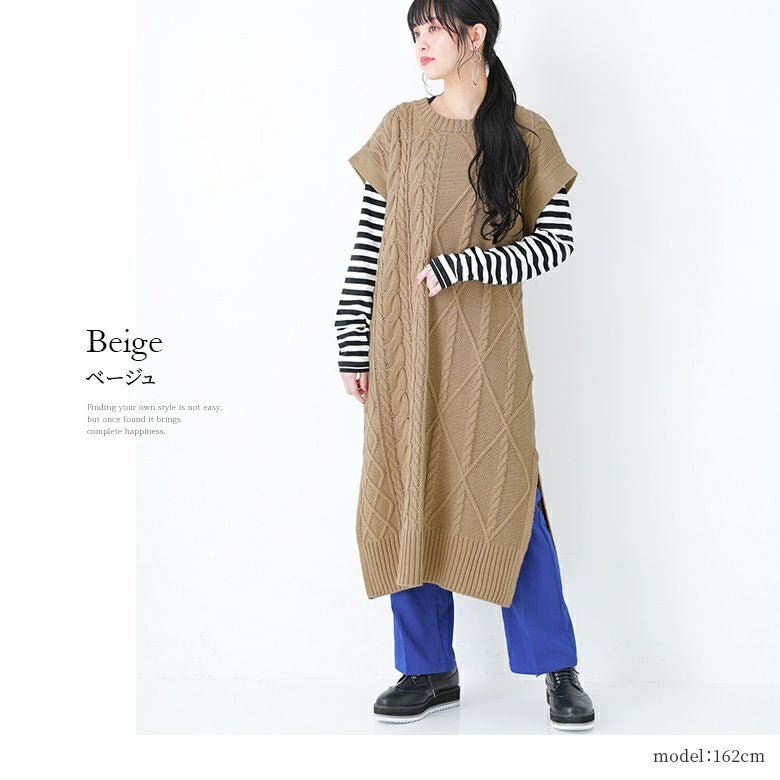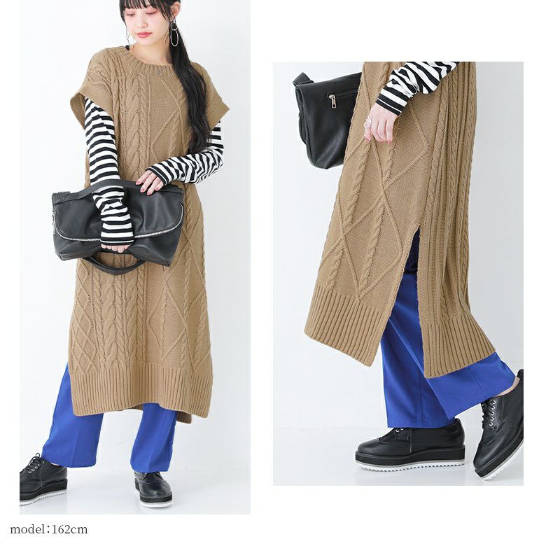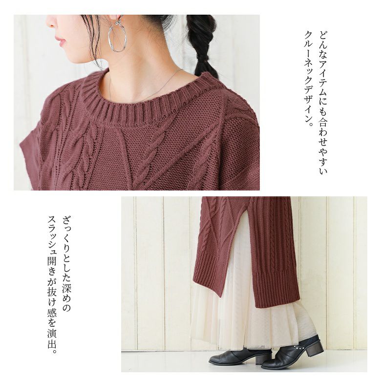 立体感のあるアシンメトリーな配列のケーブル柄&様々な編み柄の贅沢な組み合わせが見栄えすること間違いなし!しっかり長めの丈感ながら、深めの両サイドスリットで着こなしに抜け感を演出します。