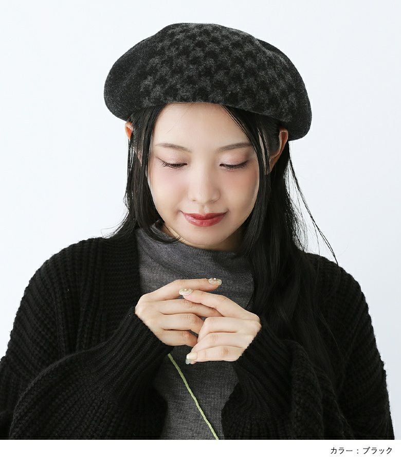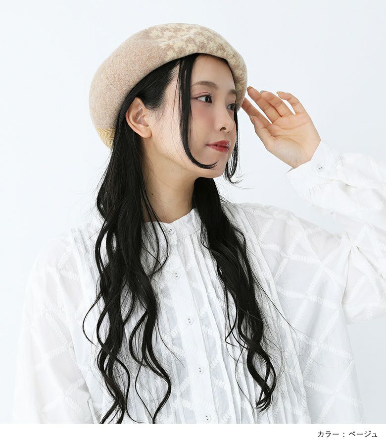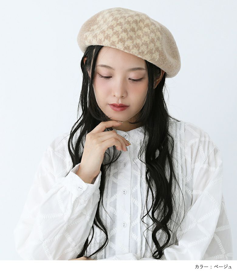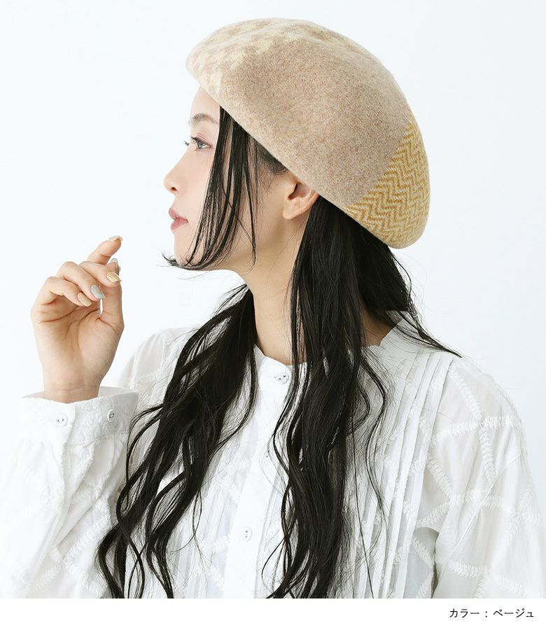 パッチワーク風デザインのニットベレー帽。自然に傾くようにアシンメトリーにデザインされており、ベレー初心者の方でも綺麗に被れるデザインです。