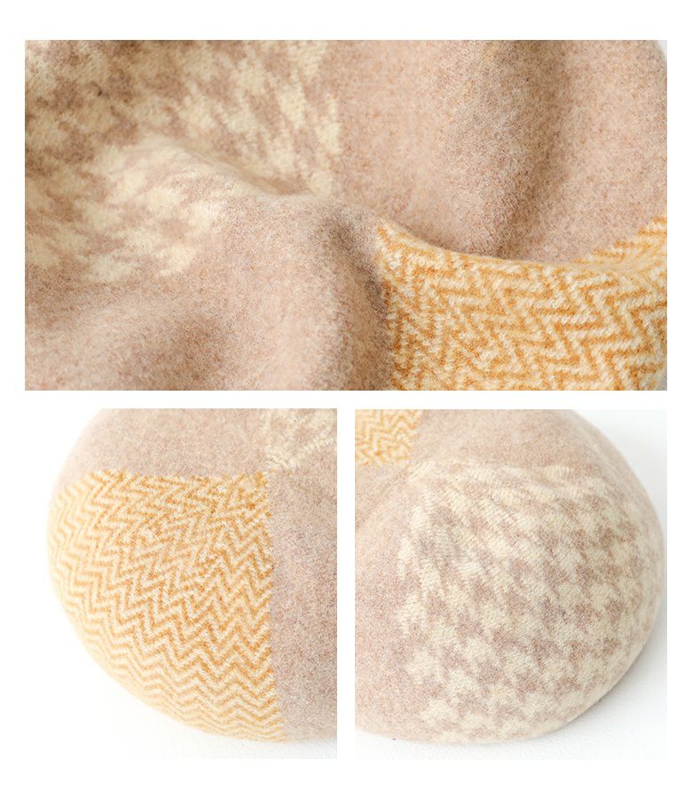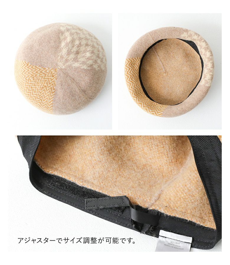暖かみのあるパッチワーク風デザインのアシンメトリーベレー帽。