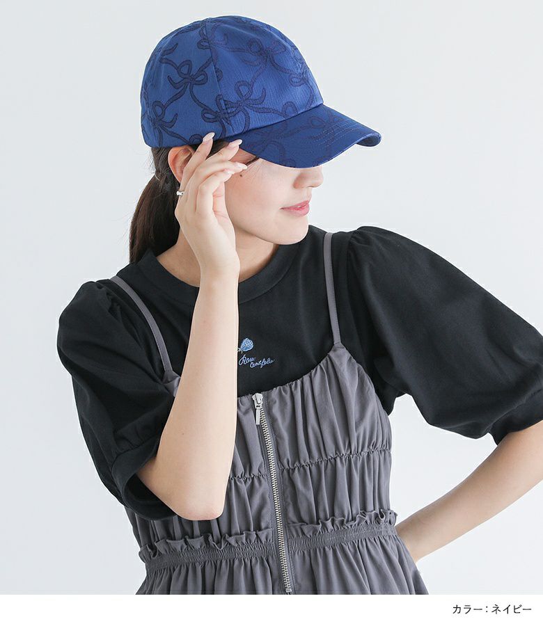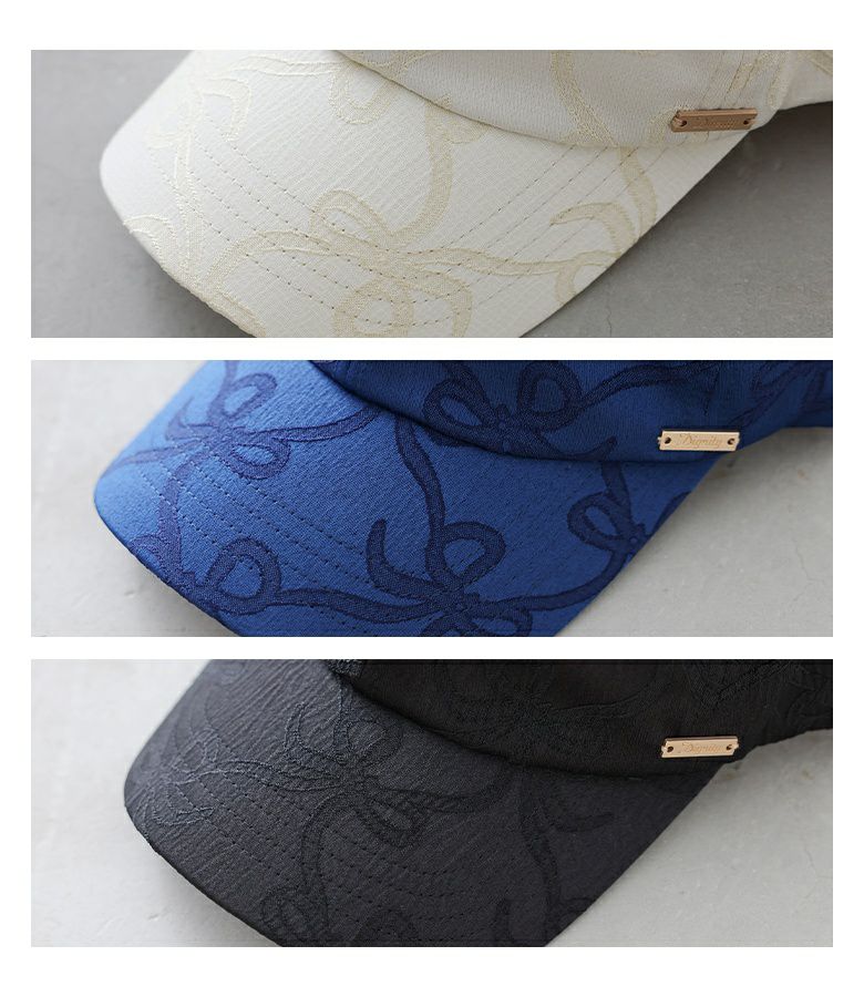 リボンのモチーフがあしらわれたデザインキャップ。ジャカード生地を使用することでリボンデザインでも甘くなりすぎず、大人の女性に似合うアイテムです。