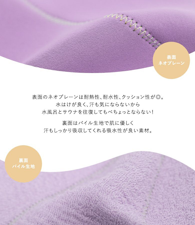 表面のネオプレーン素材は厚さが3mmある生地感で、耐熱性・耐水性・クッション性に優れているから、頭への熱を抑えのぼせ防止としてサウナをより長い時間楽しめる!裏面はパイル生地で肌に優しく、汗をしっかり吸水してくれます。