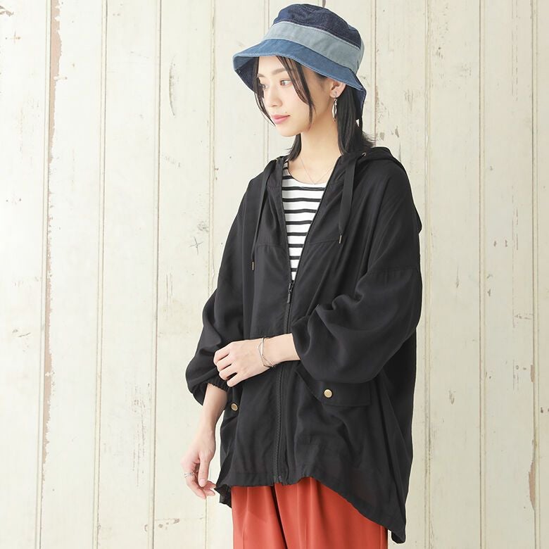 3色の配色デザインが目を惹くデニムパッチワークデザイン。柔らかなコットン混素材で、暖かい季節を中心に活躍します。手洗い出来てお手入れも簡単♪
