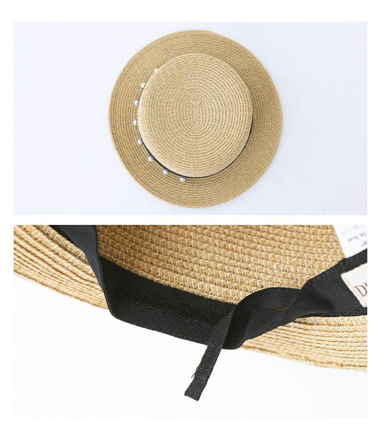 帽子の周り半分にだけ施したフェイクパールが特別感のあるデザインカンカン帽。裏側の面ファスナーでサイズ調整が可能です。