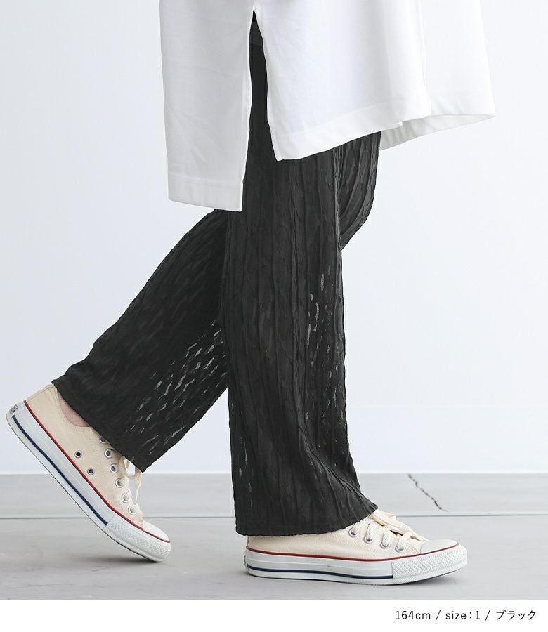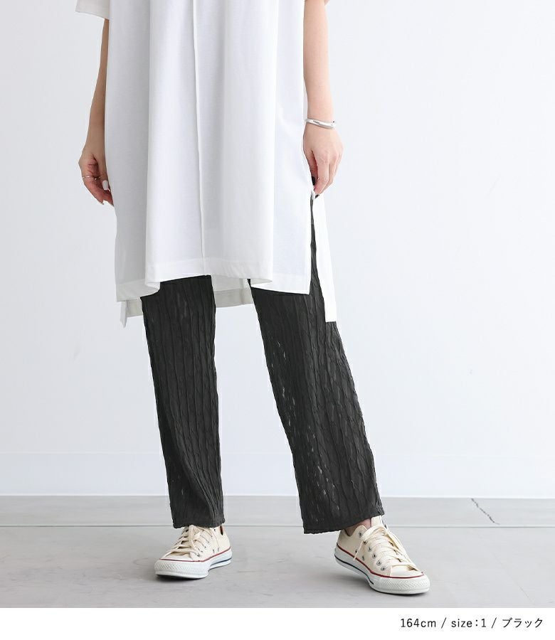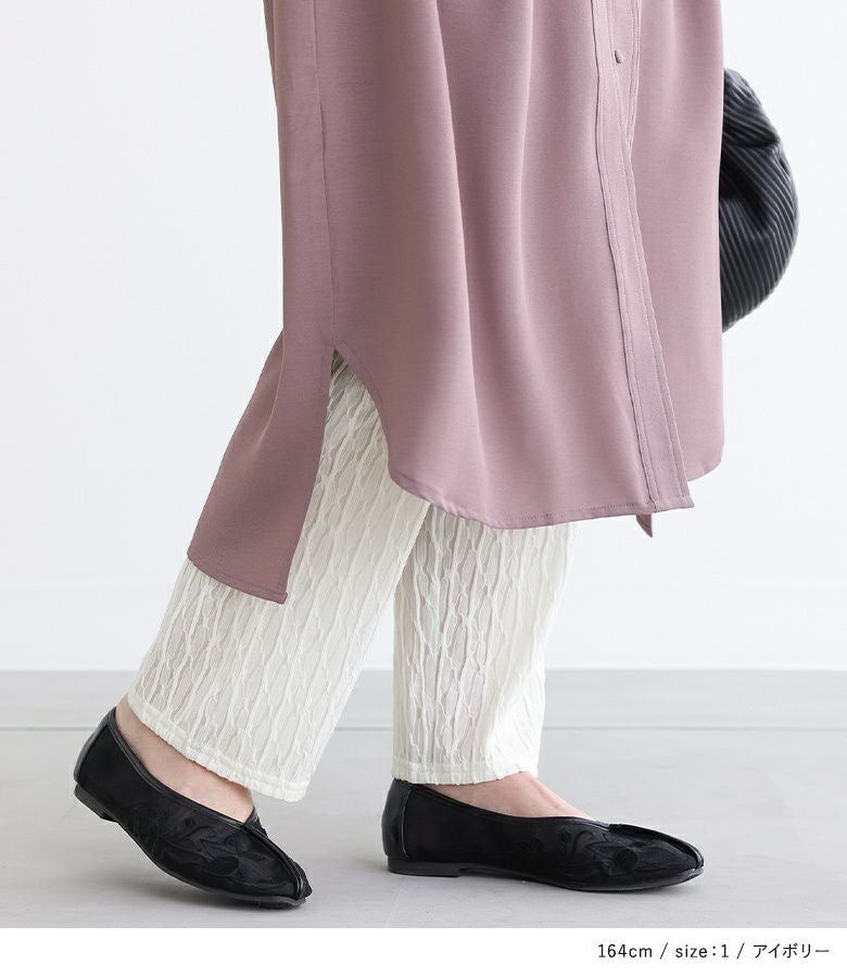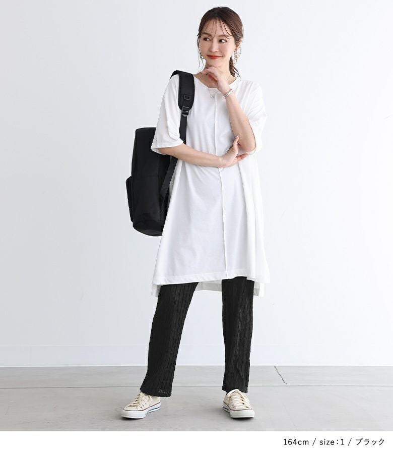 凹凸感のあるさらりとした肌触りのシアーカットソー生地で、ややストレッチ性があります。切り替え上の無地部分はストレッチの効いたカットソー生地でストレスフリーな穿き心地です。