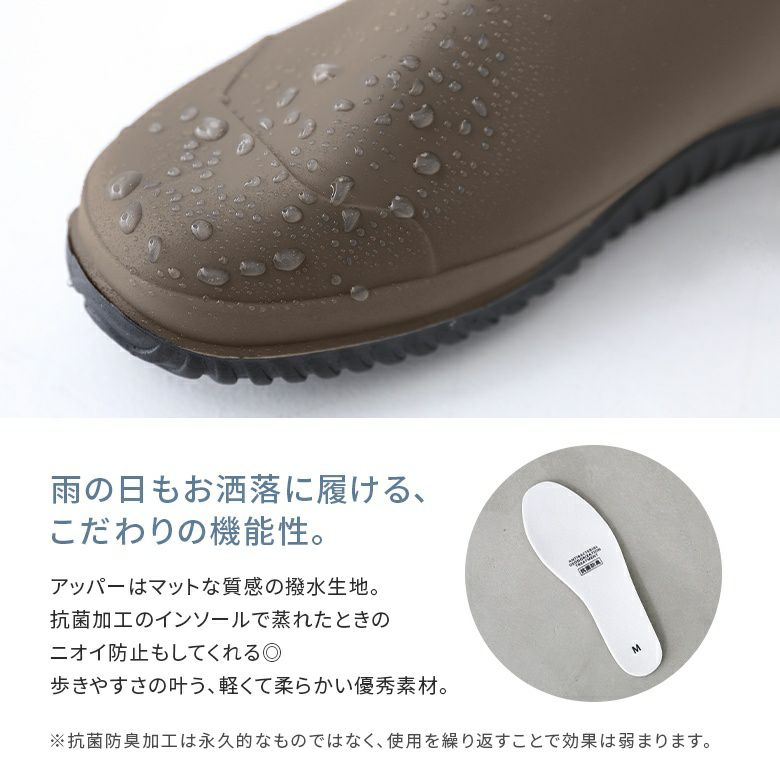 雨の日もお洒落に履けるこだわりの機能性。アッパーはマットな質感の撥水生地。抗菌加工のインソールで蒸れたときのニオイ防止もしてくれる。歩きやすさも実現した、軽くて柔らかい優秀素材!