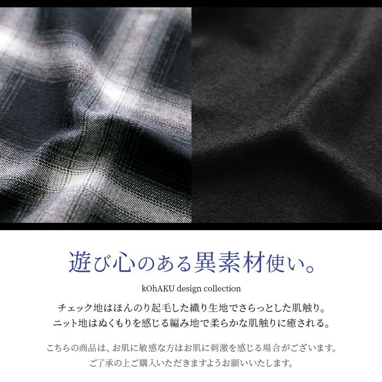 ほんのり起毛感のあるチェック生地と、程よい厚みの柔らかな無地生地の異素材MIXニット。どちらも暖かく包み込んでくれます。