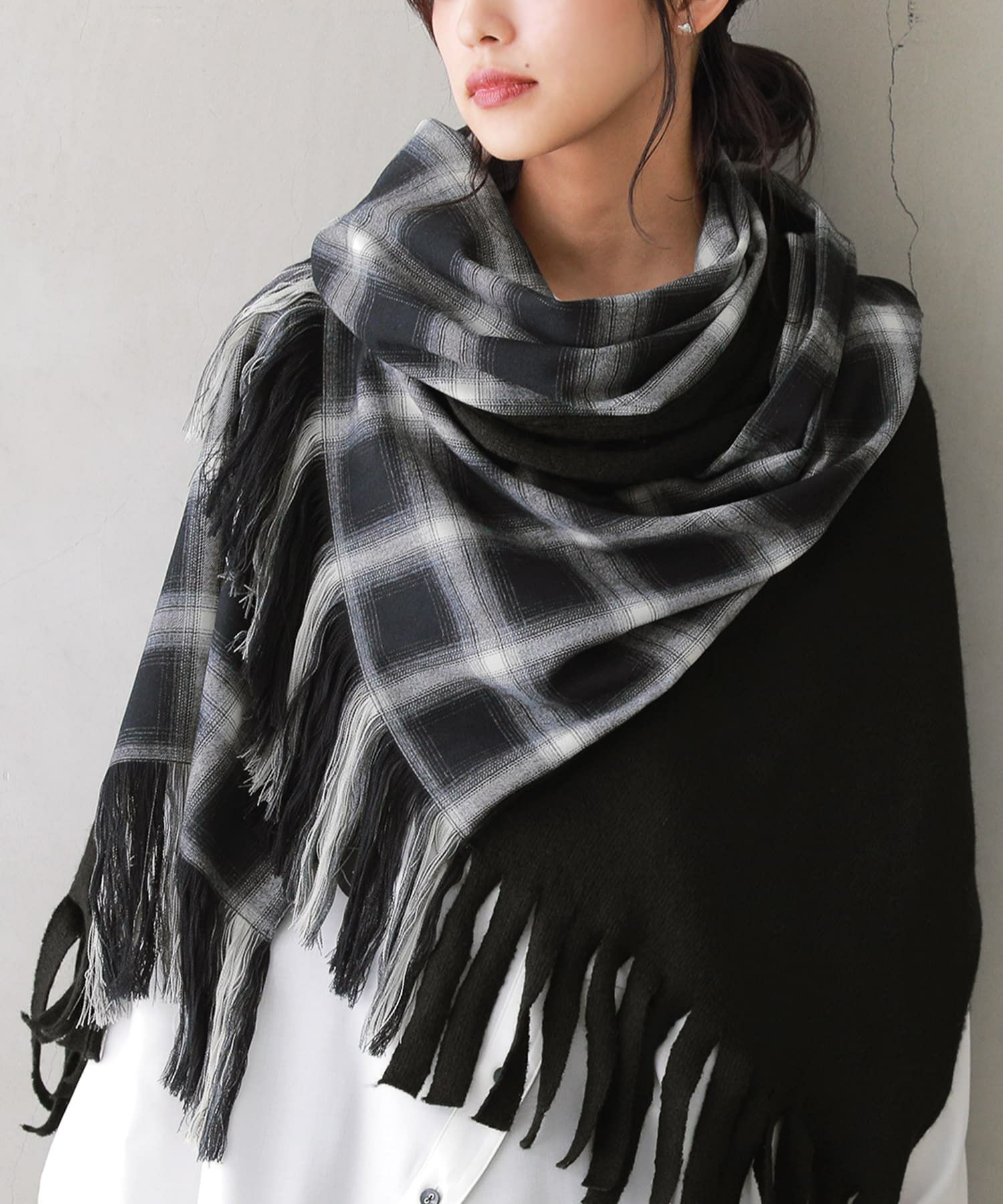 雰囲気を変えてくれる≪kOhAKU≫異素材チェックフリンジストールです。