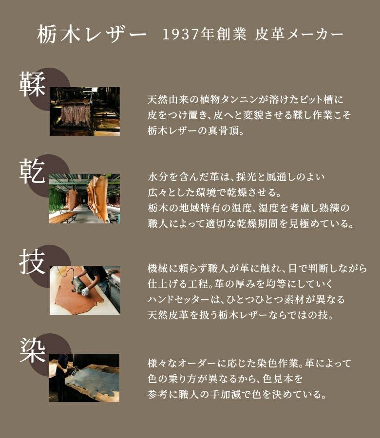 しなやかで堅牢、そして年月を重ねるごとに味わい深く変化していく皮だから経年劣化も楽しめる。使い込むほどより美しい艶や質感で丈夫で長持ち。栃木レザー社の革を使用した商品で確かな品質の証である栃木レザー赤タグがついています。