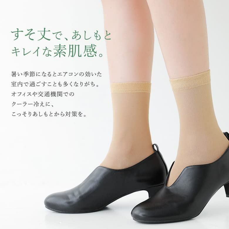 すそ丈で、あしもとキレイな素肌感。暑い季節になるとエアコンの効いた室内で過ごすことも多くなりがち。オフィスや交通機関でのクーラー冷えに、こっそり足元から対策を。