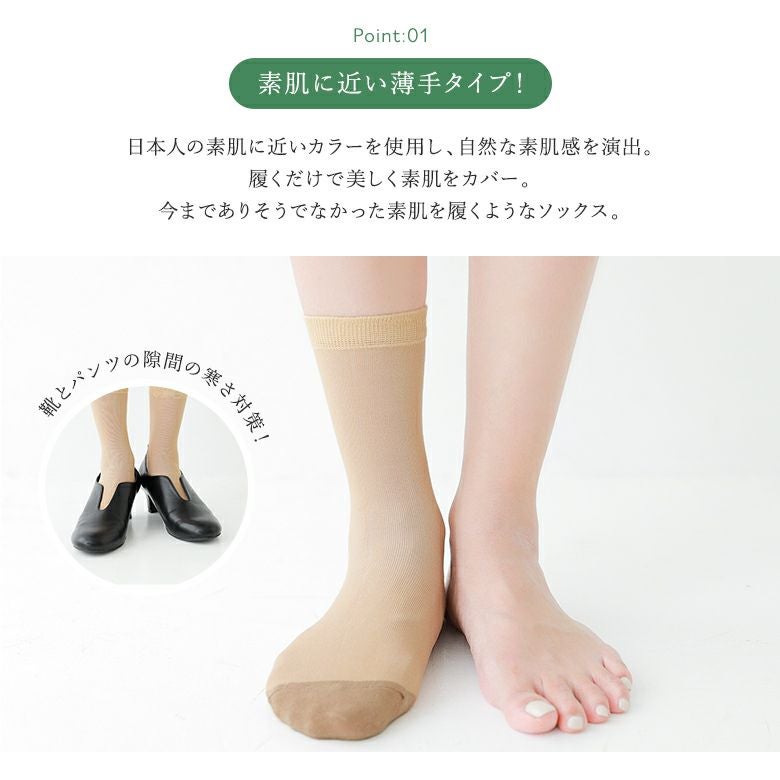 日本人の素肌に近いカラーを使用し、自然な素肌感を演出。履くだけで美しく素肌をカバー。今までありそうでなかった素肌を履くようなソックス。