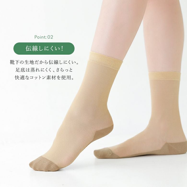 靴下の生地だから伝線しにくい。足底は蒸れにくく、さらっと快適なコットン素材を使用。