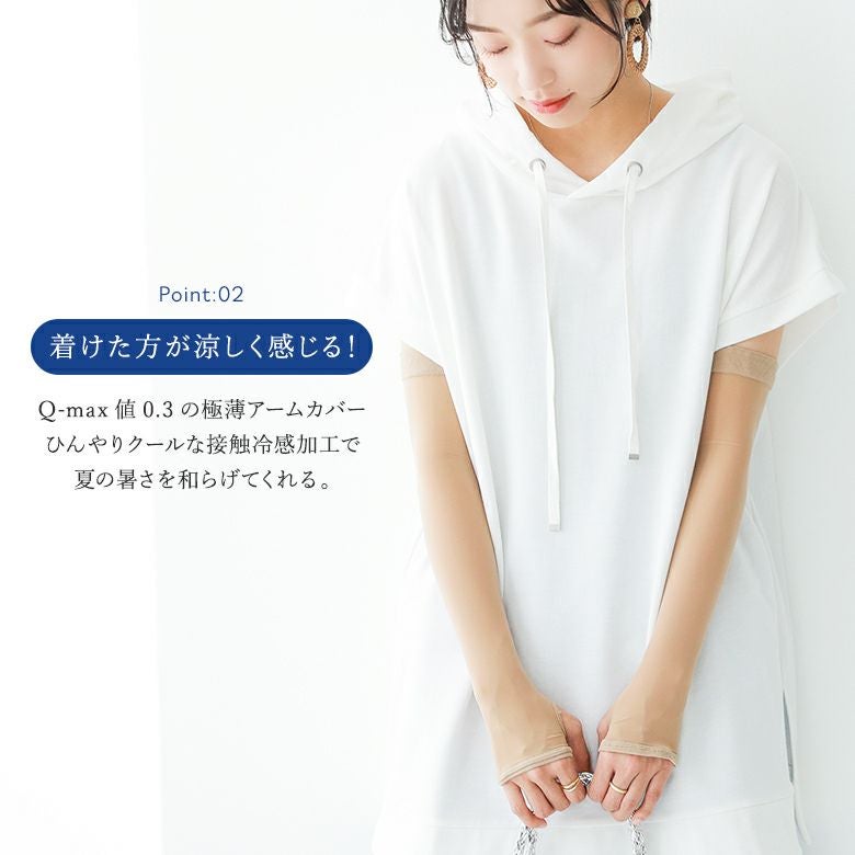 Q-max値0.3の極薄アームカバー。ひんやりクールな接触冷感加工で着けた方が涼しく。夏の暑さを和らげてくれます。
