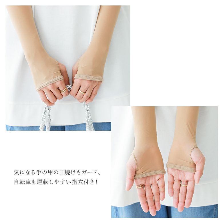 気になる手の甲の日焼けもガードし、自転車も運転しやすい指穴付き、極薄涼感ひんやりアームカバー。