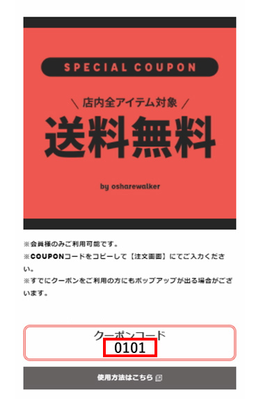 お客様にて、【注文画面】でクーポンコードを入力いただく必要のあるクーポンがございます。