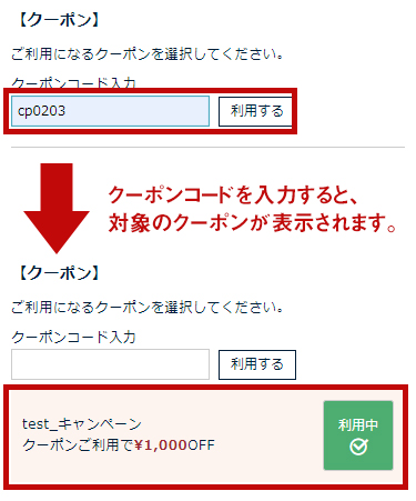 【注文画面】でクーポンコードを入力して取得が完了します。