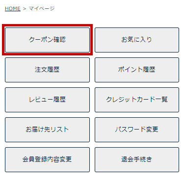 【マイページ】の【クーポン確認】より付与されたクーポンをご確認いただけます。