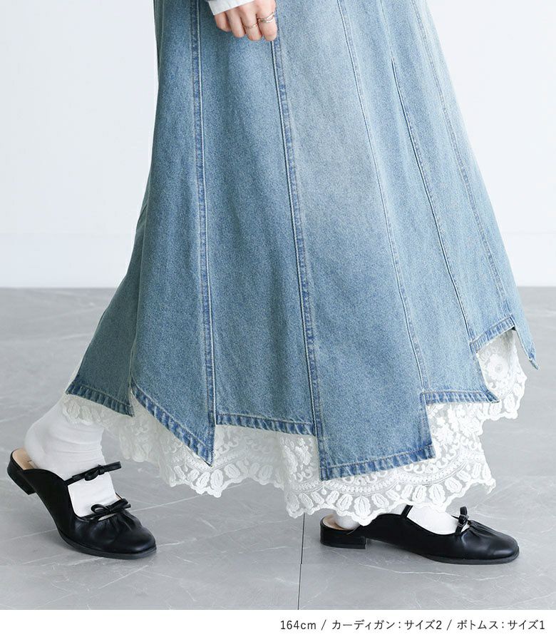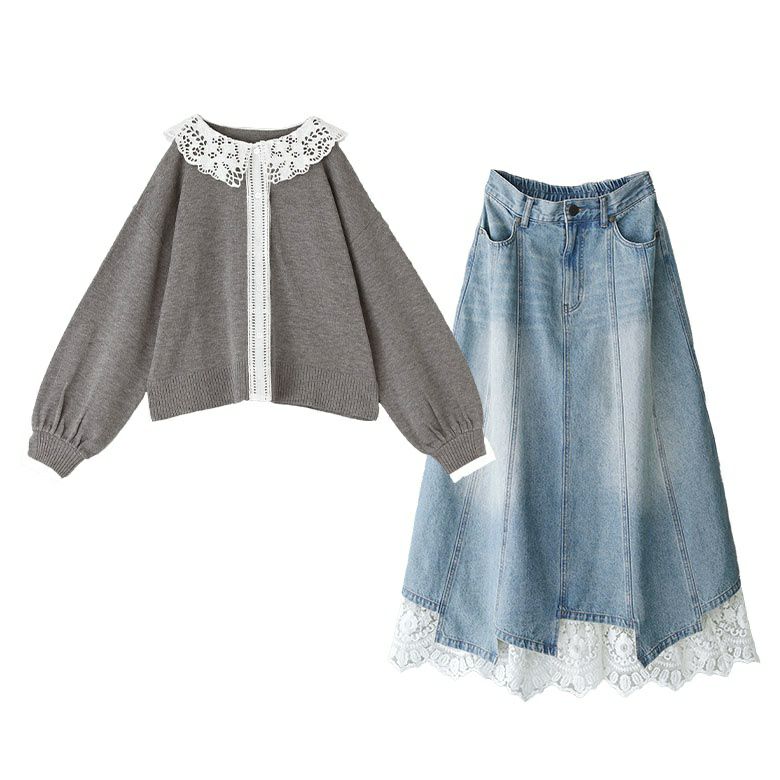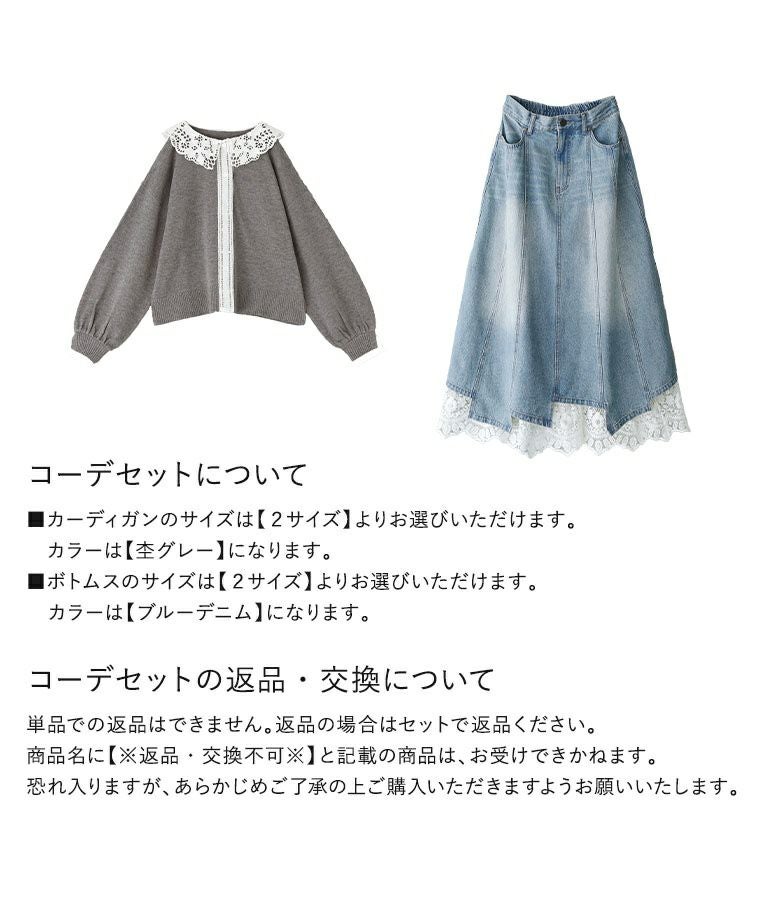 他の画像を見る 送料無料★届いてすぐにお洒落に変身2点コーデSET♪ 【送料無料】『レース襟ニットカーディガン×レースペチ付きアシメ切替デニムスカートコーデ2点SET』【メール便不可】【40】 ¥ 18,960 税込 (0)