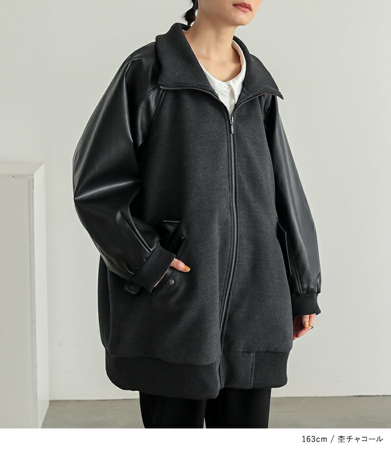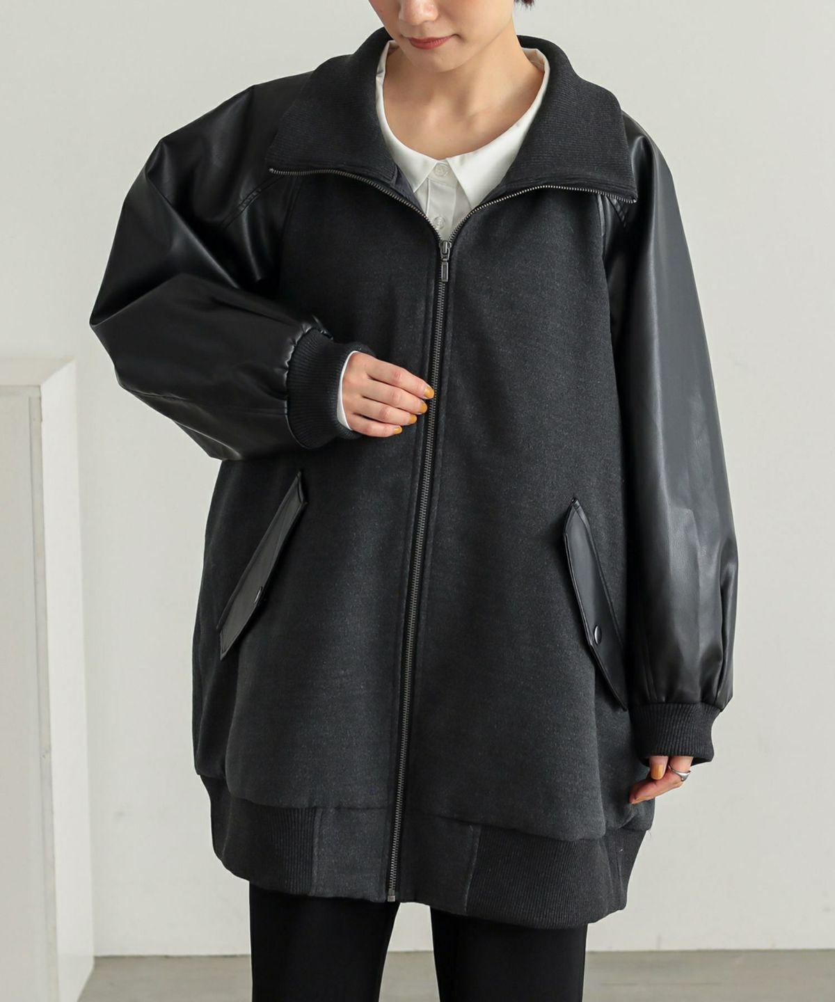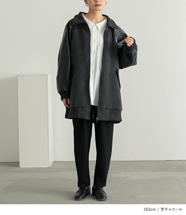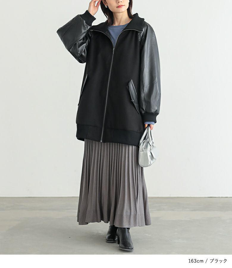 他の画像を見る メルトン生地×レザー調生地を切替えたロング丈の異素材切替ブルゾン。 『n'OrLABELハイネックレザー切替ロングブルゾン』【メール便不可】【30】 ¥ 7,980 税込 3.00 (1)