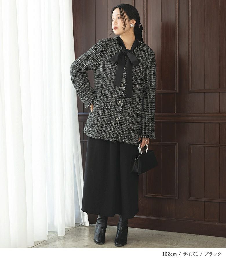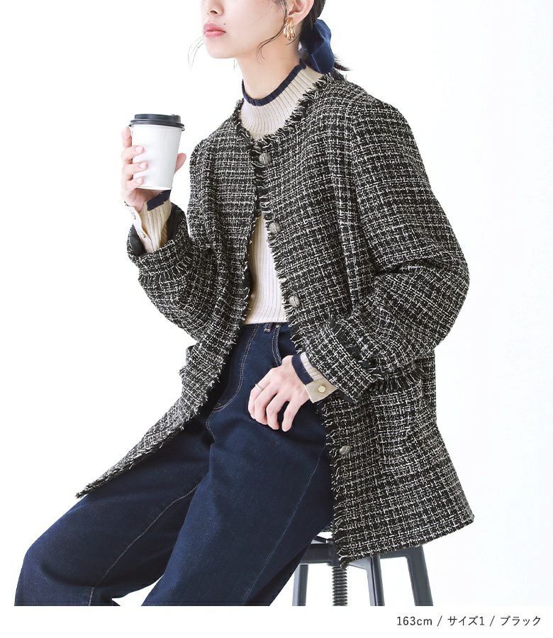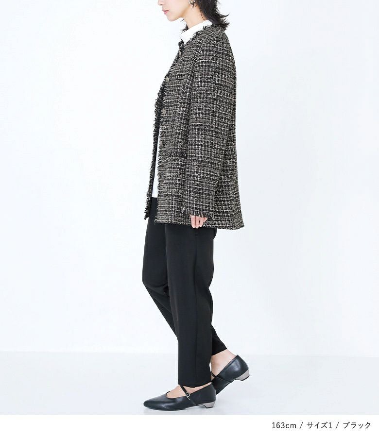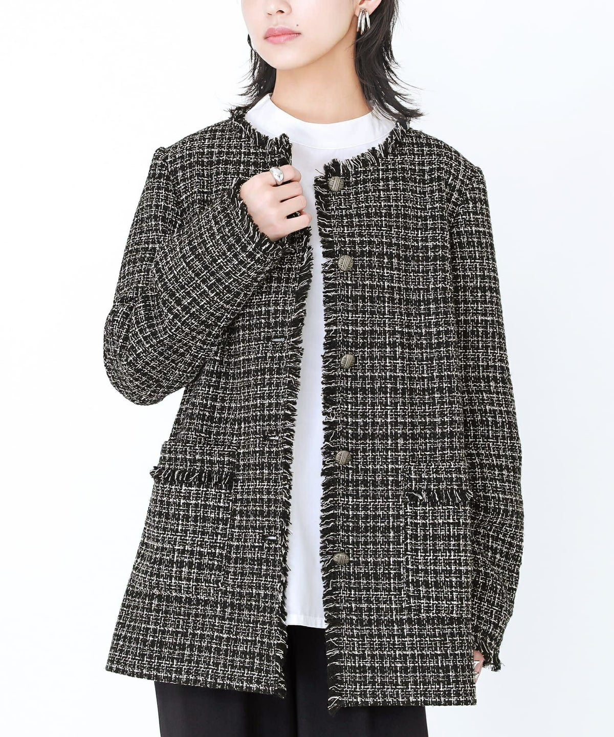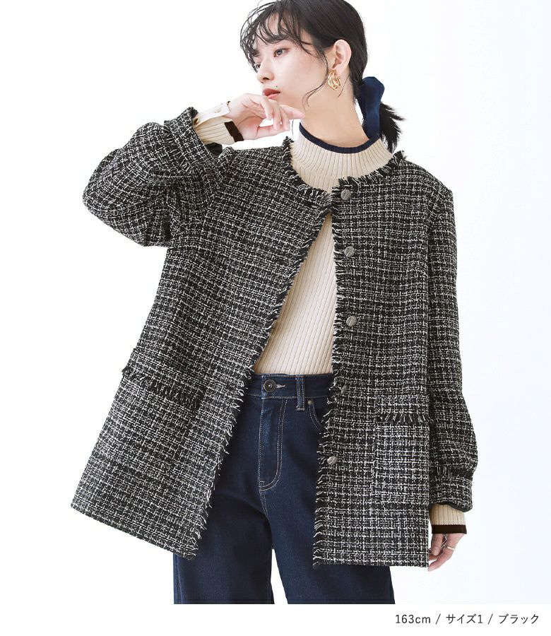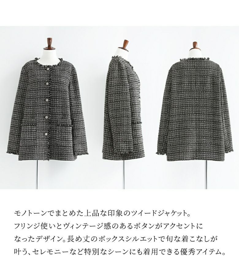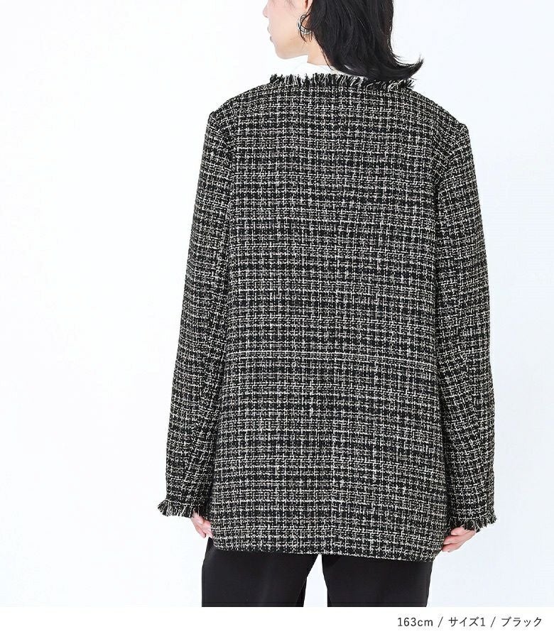 他の画像を見る 【10%OFF】選べるM~3Lサイズ展開!上品な印象のモノトーンツイードジャケット。 『n'OrLABELツイードノーカラージャケット』※返品交換不可※【メール便不可】【30】 販売期間 2026/02/27 0:00 〜 2026/03/04 23:59 定価 ¥ 6,980 のところ ¥ 6,282 税込 5.00 (1)