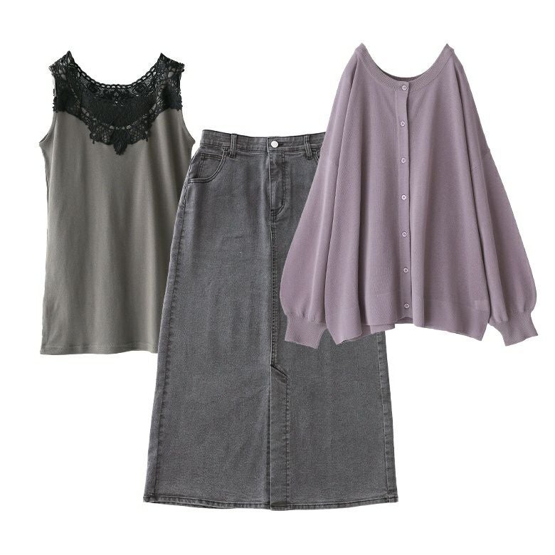 他の画像を見る 送料無料★届いてすぐにお洒落に変身3点コーデSET♪ 【送料無料】『襟元レースデザインタンク×ストレッチデニムスカート×前後2wayシアーニットカーディガンコーデ3点SET』【メール便不可】【25】 ¥ 11,530 税込 (0)
