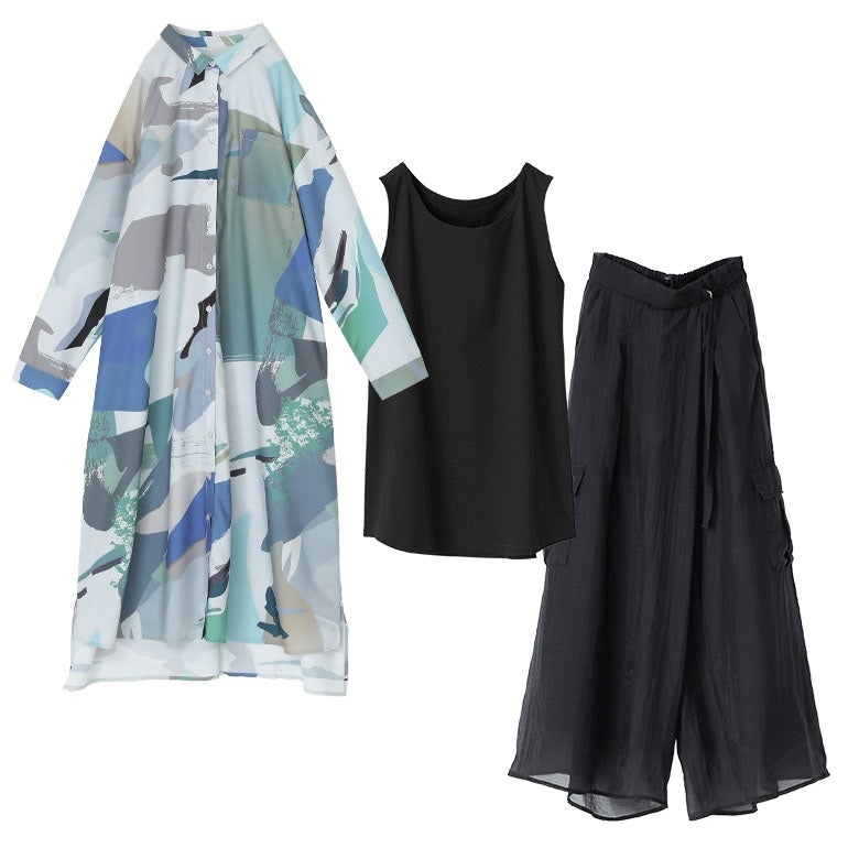 他の画像を見る 届いてすぐにお洒落に変身3点コーデSET♪ 『アート柄シャツワンピース×シンプルコットンタンクトップ×シアーワイドカーゴパンツコーデ3点SET』【メール便不可】【25】 ¥ 15,610 税込 (0)