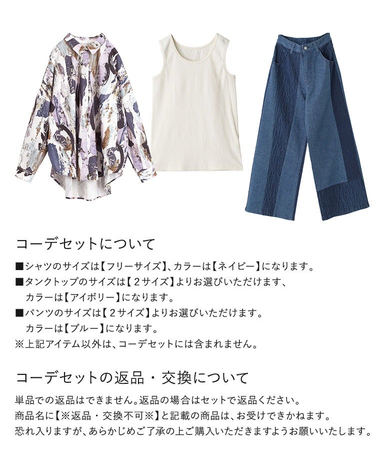 他の画像を見る 届いてすぐにお洒落に変身3点コーデSET♪ 『水彩プリントシャツ×リブタンクトップ×柄配色切替デニムパンツコーデ3点SET』【メール便不可】【35】 販売開始前です。 販売期間 2026/04/04 10:00 〜 2027/03/30 23:59 ¥ 12,730 税込 (0)