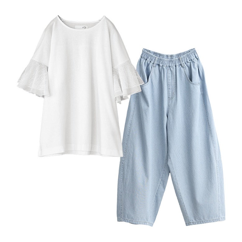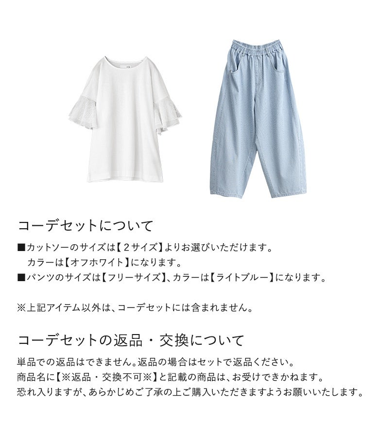 他の画像を見る 届いてすぐにお洒落に変身2点コーデSET♪ 『汗じみ防止ひらりレース袖カットソー×ワイドデニムサロペットコーデ2点SET』【メール便不可】【40】 販売期間 2026/04/10 10:00 〜 2027/04/08 23:59 ¥ 9,570 税込 (0)